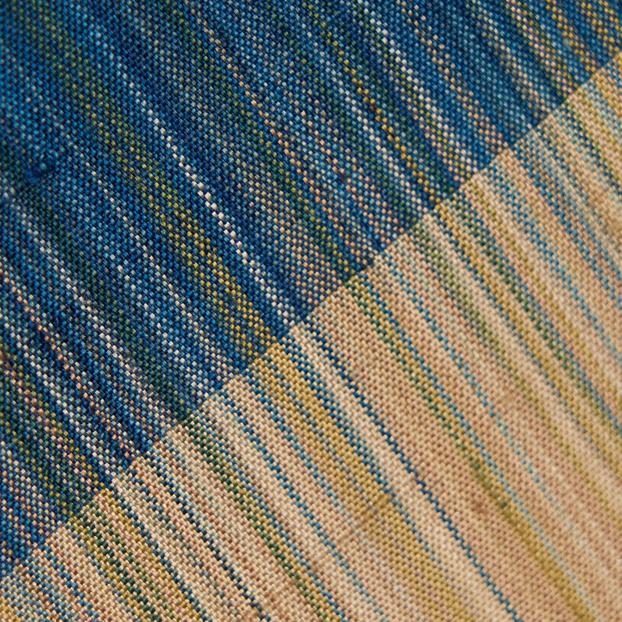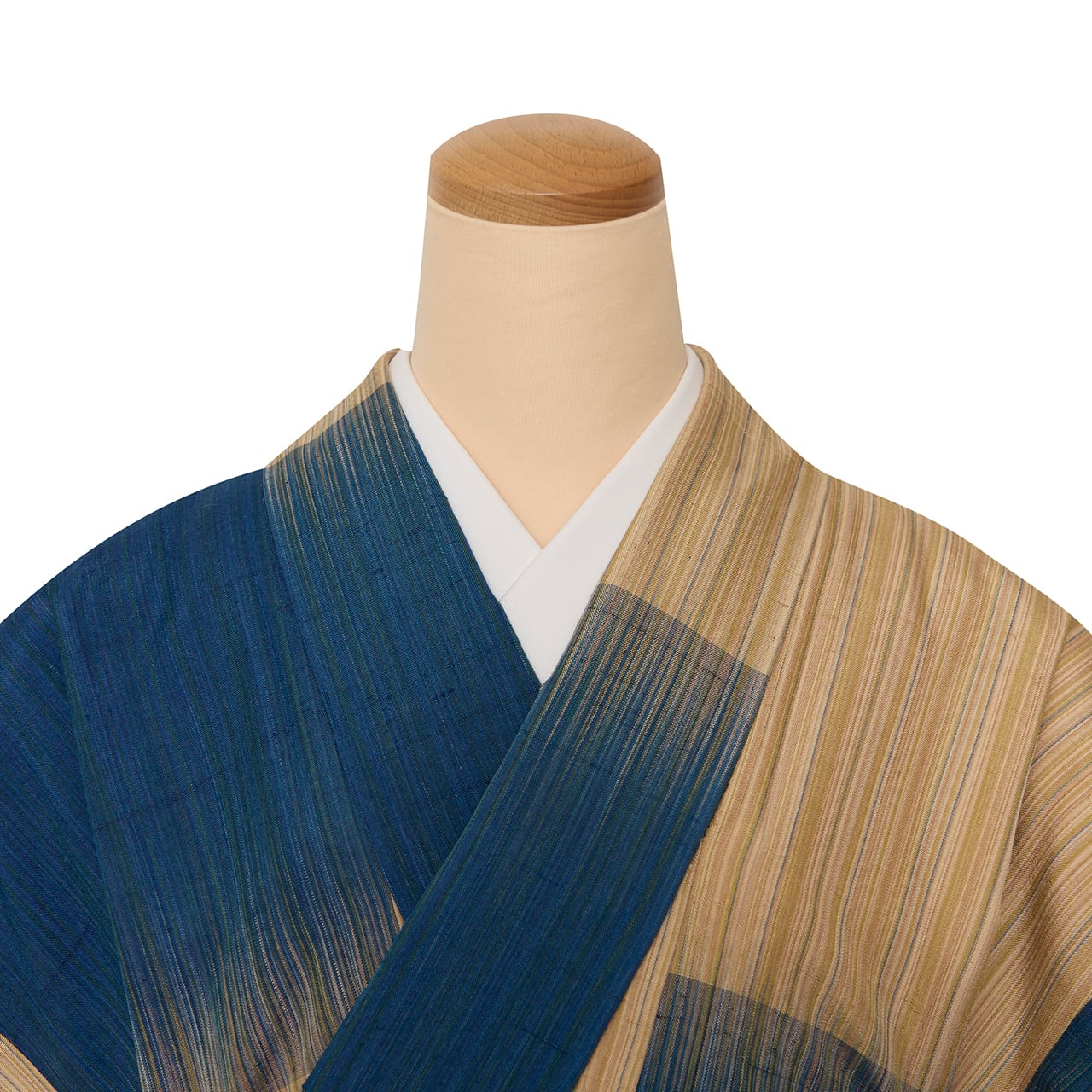 座繰りで引かれた風合いの良い糸が草木で染められて、ニュアンスのある縞模様を織り成していて、それに交差するように取られた藍色の段は、経糸の絣の足にまたとても味わいが感じられて、キッパリとした色使いでありながらも柔らかい印象もあるものとなっています。