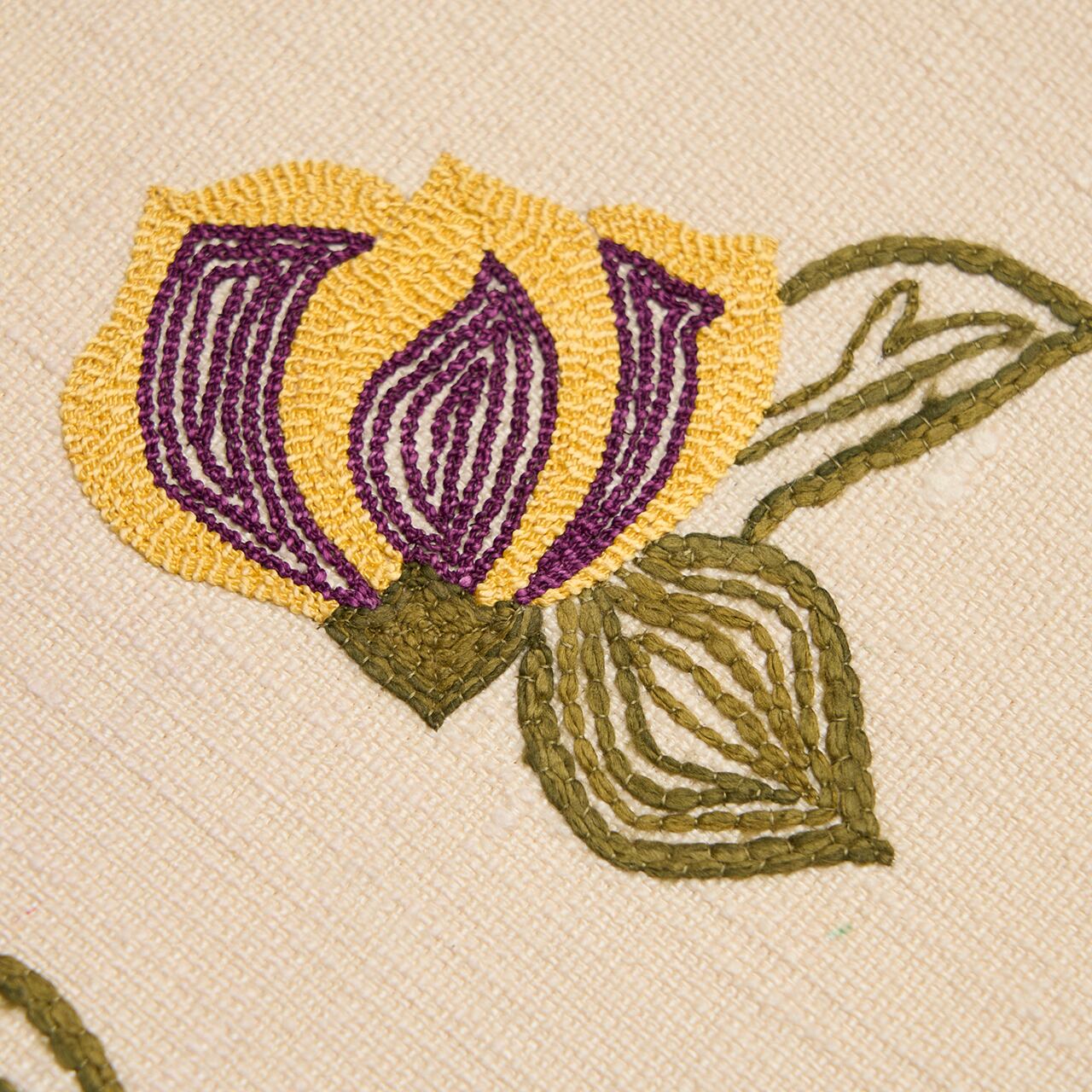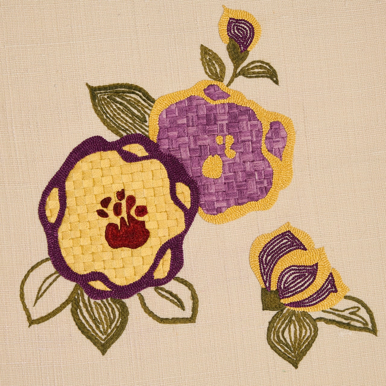 貝紫で染められたお花の発色がとても綺麗で、紫と補色関係にあるサフラン染めの黄色とのコントラストがとても鮮やかで、活き活きとしたフレッシュさが感じられます。