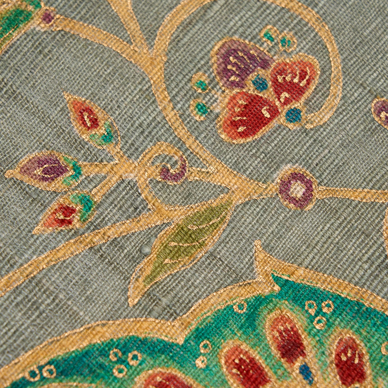 全て手描きで糊置きをして彩色をされていて、模様の縁には金泥で縁取りも入れられています。