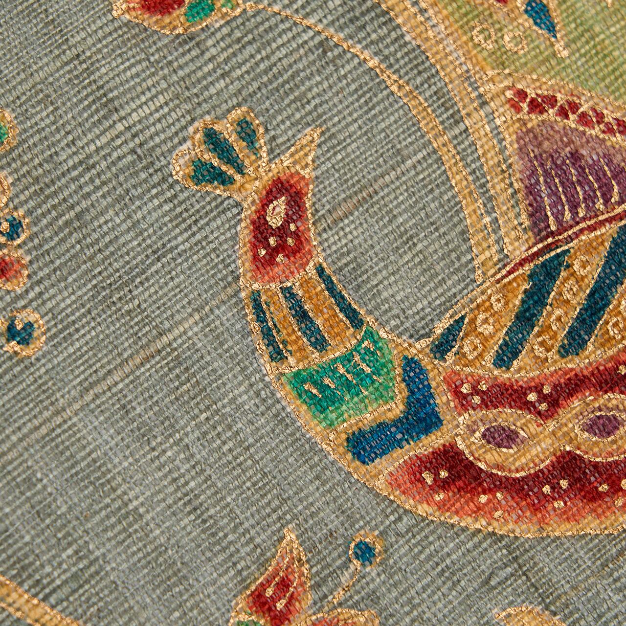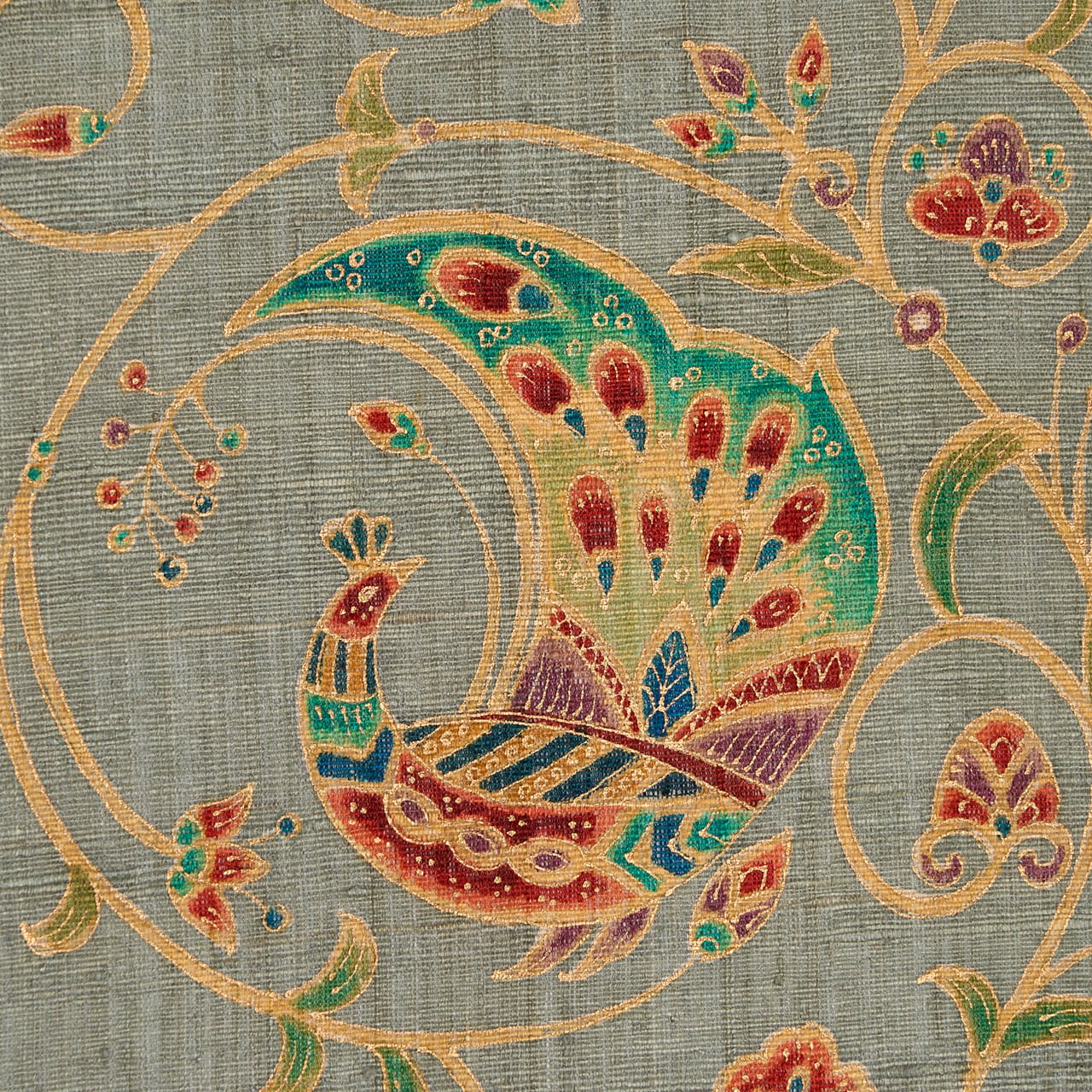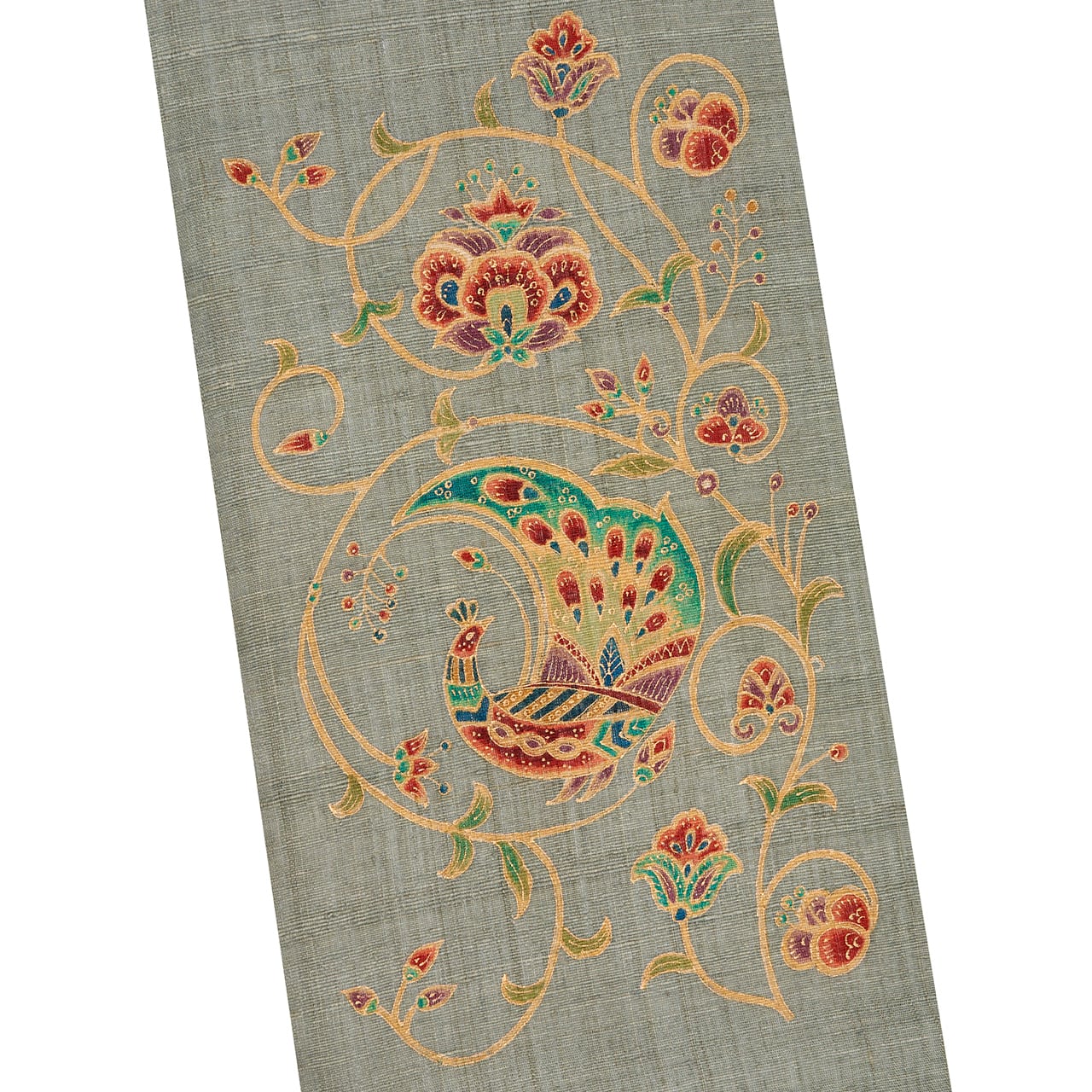 横にざっくりとした節の見られる座繰りの生紬地が、少し緑味と青味のあるグレー・湊鼠色に染められ、お太鼓にはくるくると枝を広げる蔓草が白橡色でおおらかに描かれ、いろいろな形の唐花が咲いて、その中心には孔雀のような綺麗な羽を広げる美しい鳥が佇んでいるといった、少しオリエンタルな雰囲気のある素敵な更紗模様の九寸名古屋帯です。
