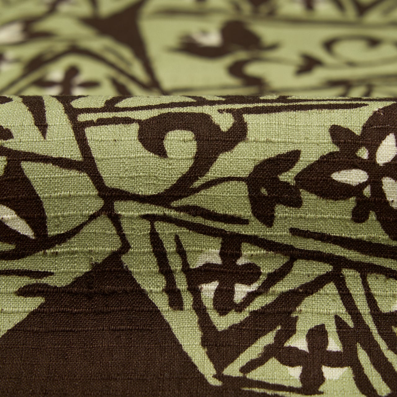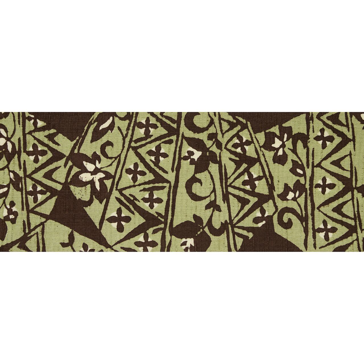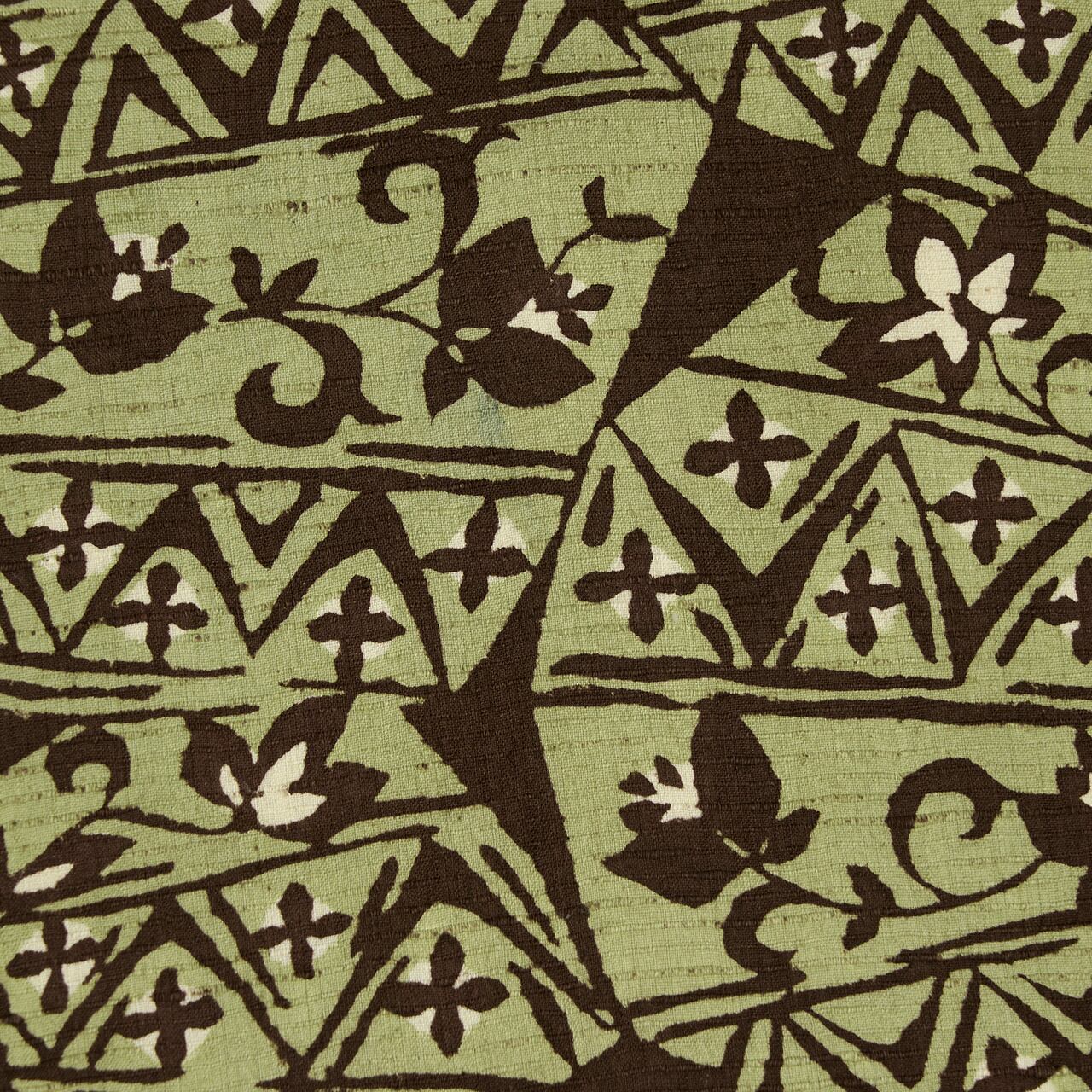 濃い焦げ茶の地色に、大胆に取られた六角形の青白橡色の淡い緑がコントラストも鮮やかに際立っていて、その中の蔓花模様や幾何学模様が元気よく弾むように描かれているのも楽しげです。