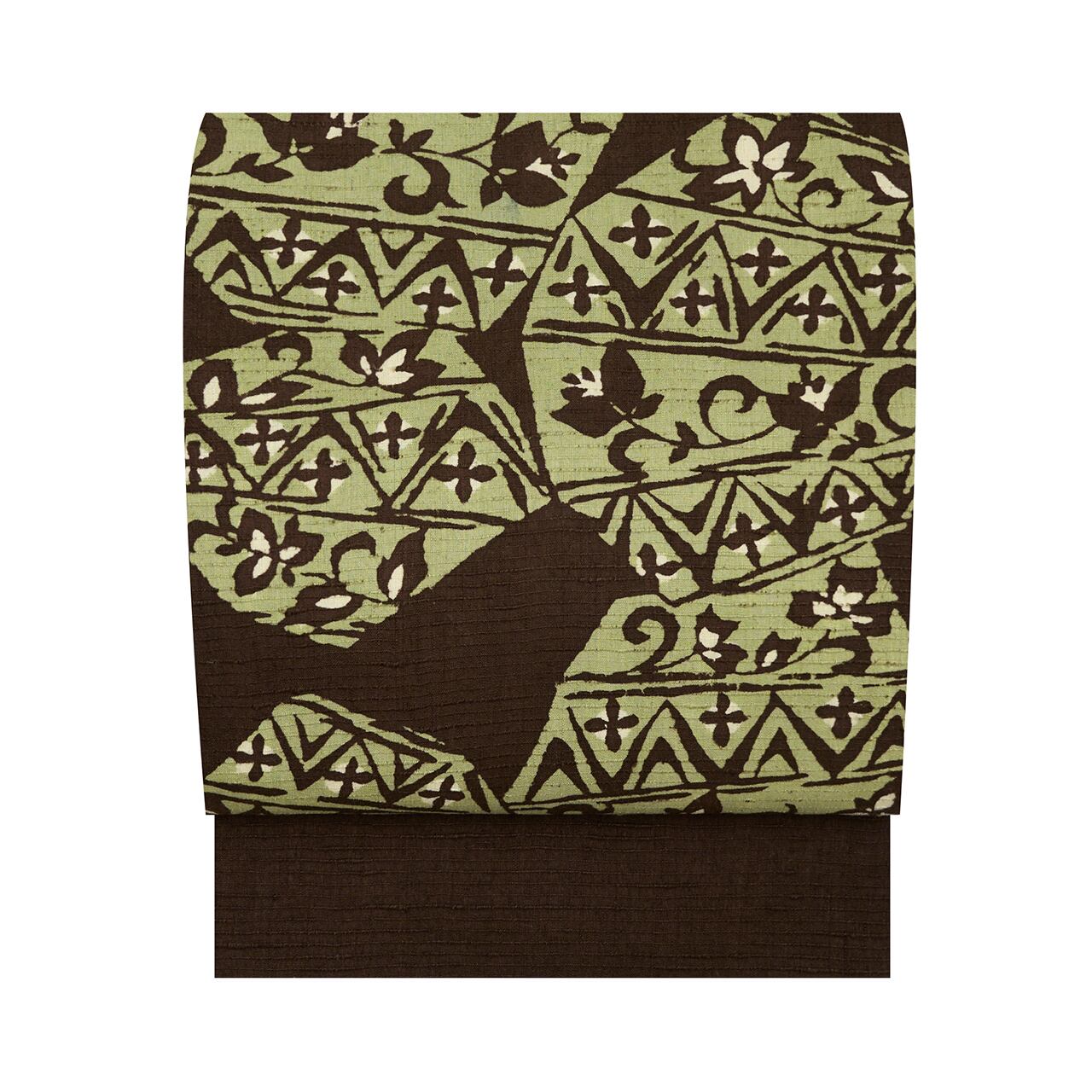 横に約5mmおきに太い糸が織り込まれて横縞の地織になった紬地が、少しだけ赤味のある濃い焦げ茶・黒鳶色に染められ、それに大小の六角形が2列に取られてグレー味のある薄緑・青白橡色に染められた中に、地色と同じ黒鳶色でジグザグに十字や花唐草の模様が描かれた、切り絵のようなラフなタッチが面白い雰囲気の、お洒落な全通の九寸名古屋帯です。