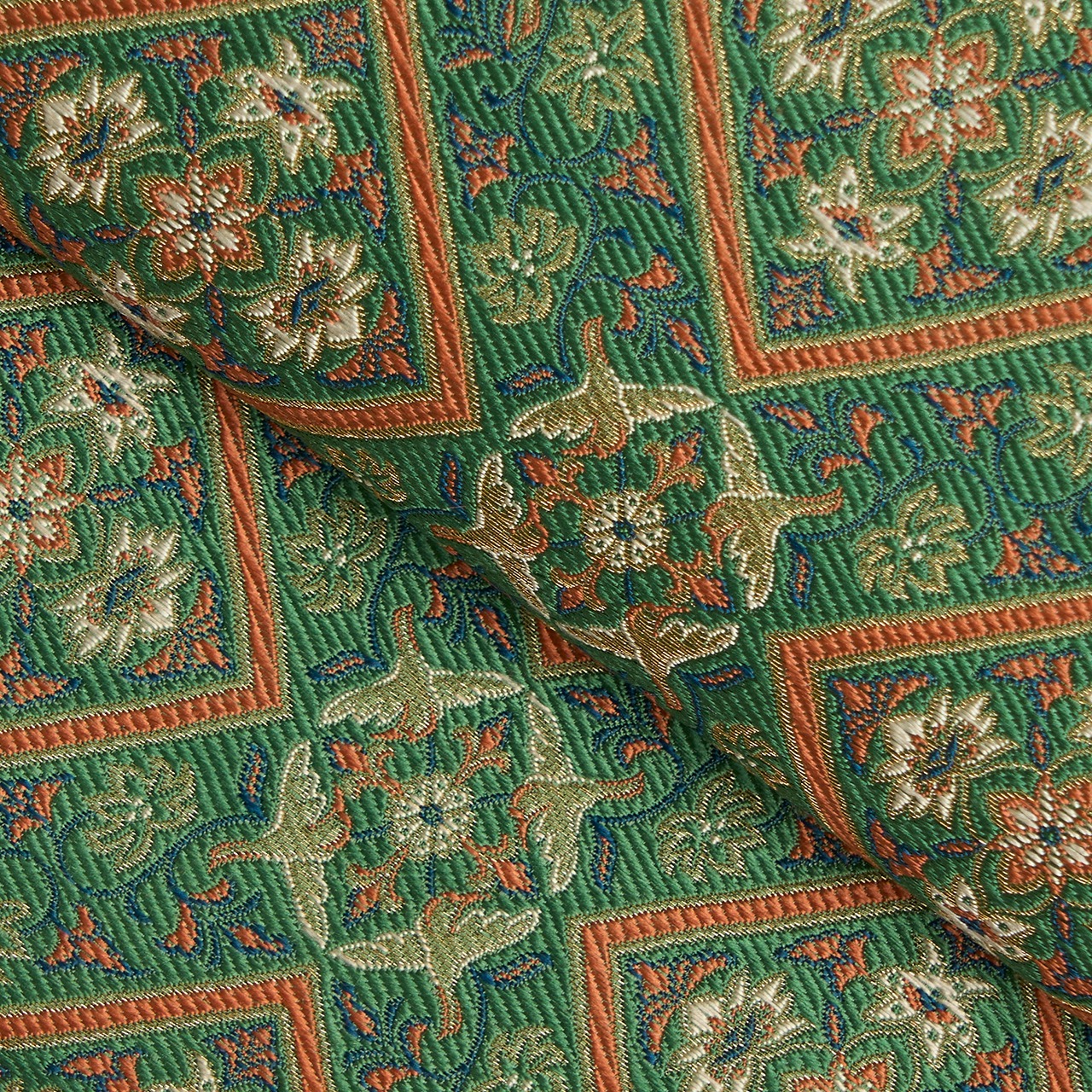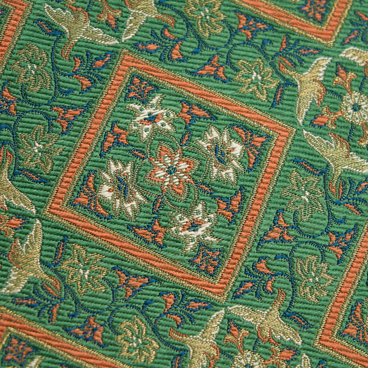 綺麗な色使いで表された格調の高さのある文様が、金糸も交えながら美しく織り出されていて、上質でしなやかな質感と共に品格のある輝きを持って、素敵な佇まいとなっています。
