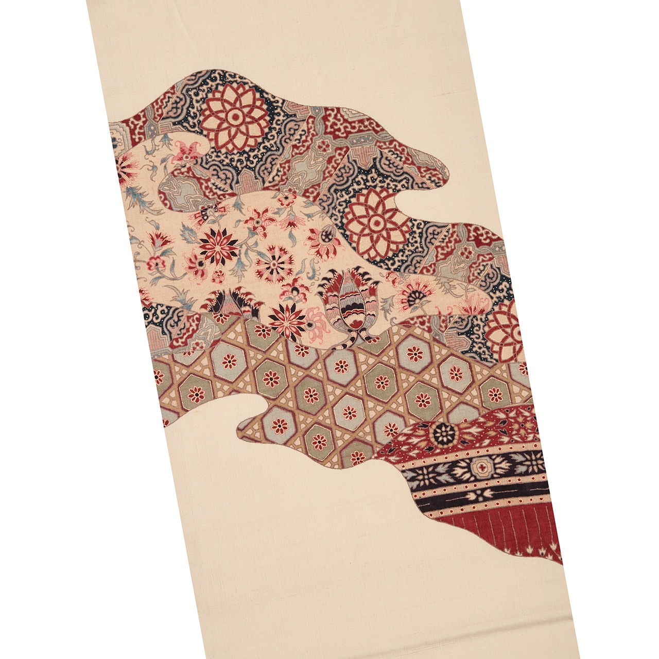 インドやジャワ更紗のようなアジアンテイストの模様と、少し和更紗的な蜀江錦や花亀甲の模様などが入れ混ざって描かれているのも、興味深く見ることができます。