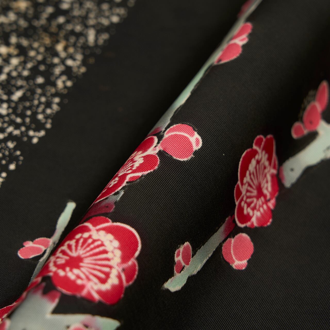 手描き蝋纈で染められていて、友禅より少しラフなタッチとなっていますが、槍梅のようにシュッと伸びた枝やこぼれるように咲いたお花の雰囲気などが、かえって臨場感を感じさせているように見えます。