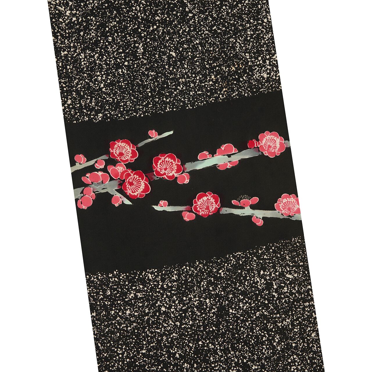 しなやかな質感の塩瀬の生地が黒に染められ、お太鼓と前柄の一部を黒く残して全体に細かな水玉のような蝋散らしが施されて、その黒い部分には今様色と長春色の濃淡の濃いピンクでふっくらとした可愛らしい梅のお花が描かれた、初春の雰囲気を表したとても素敵な九寸名古屋帯です。