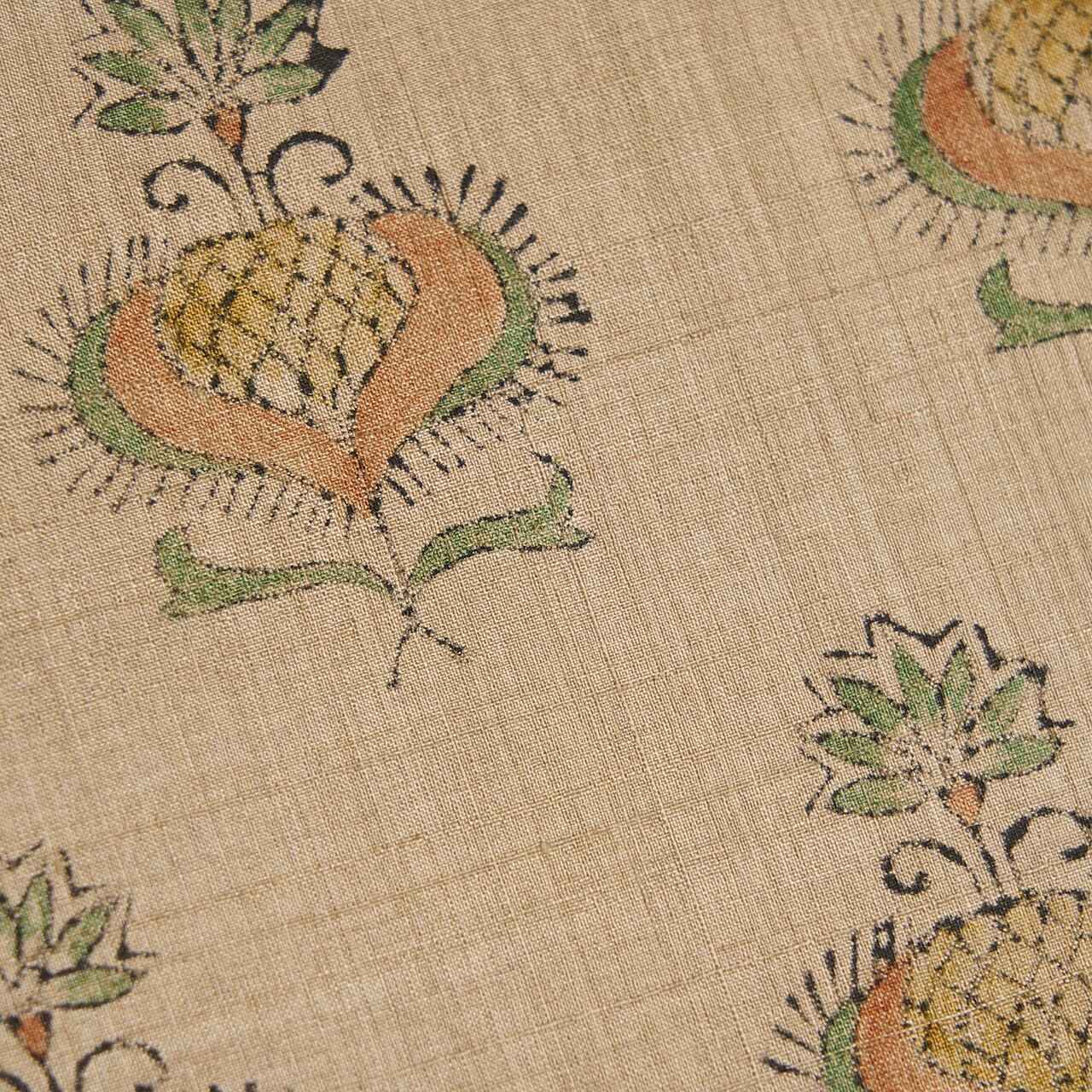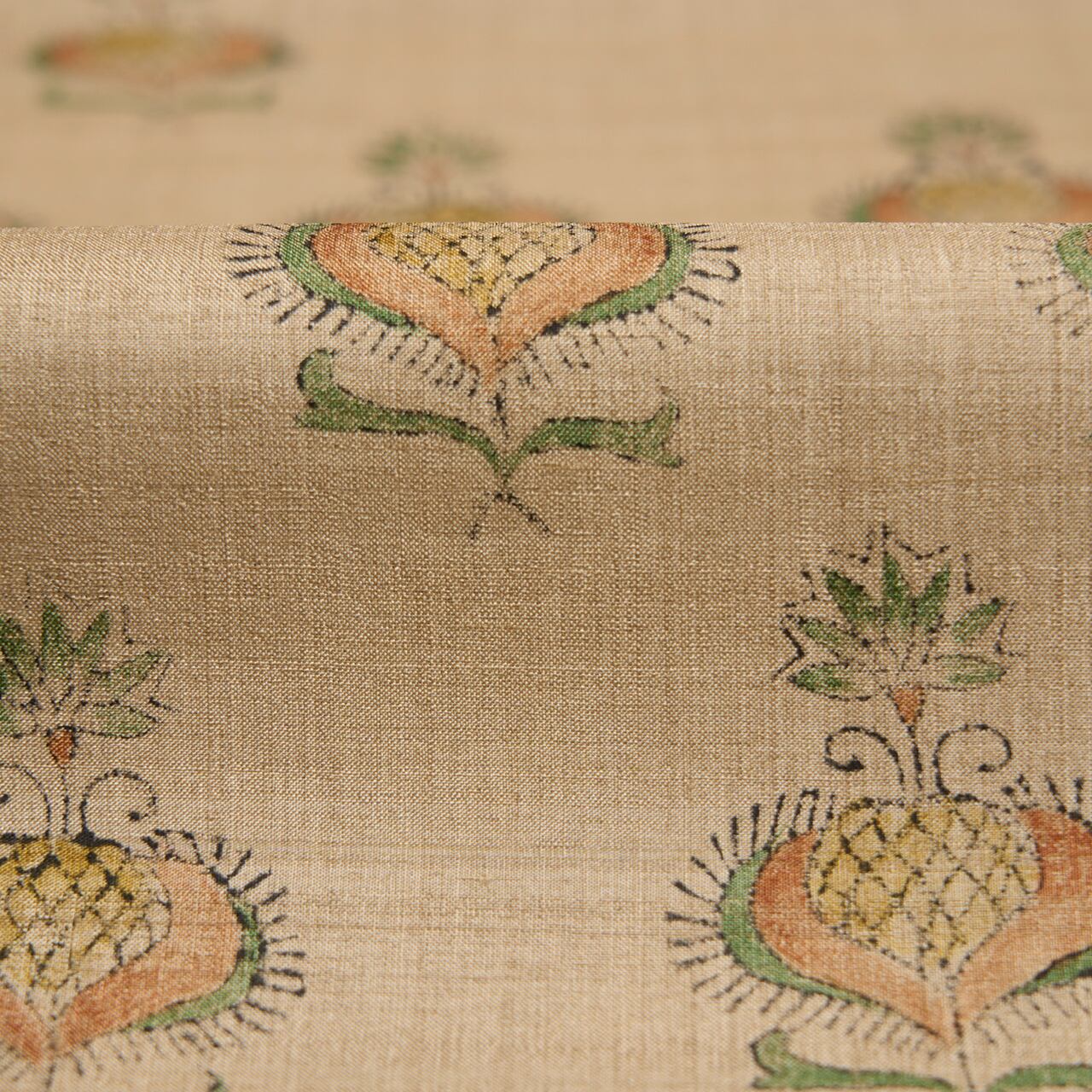 天然の野蚕糸の中でも最高の位置づけとされている、金色に輝くゴールデンムガシルクの生地に更紗模様が染められた素敵な袋帯です。