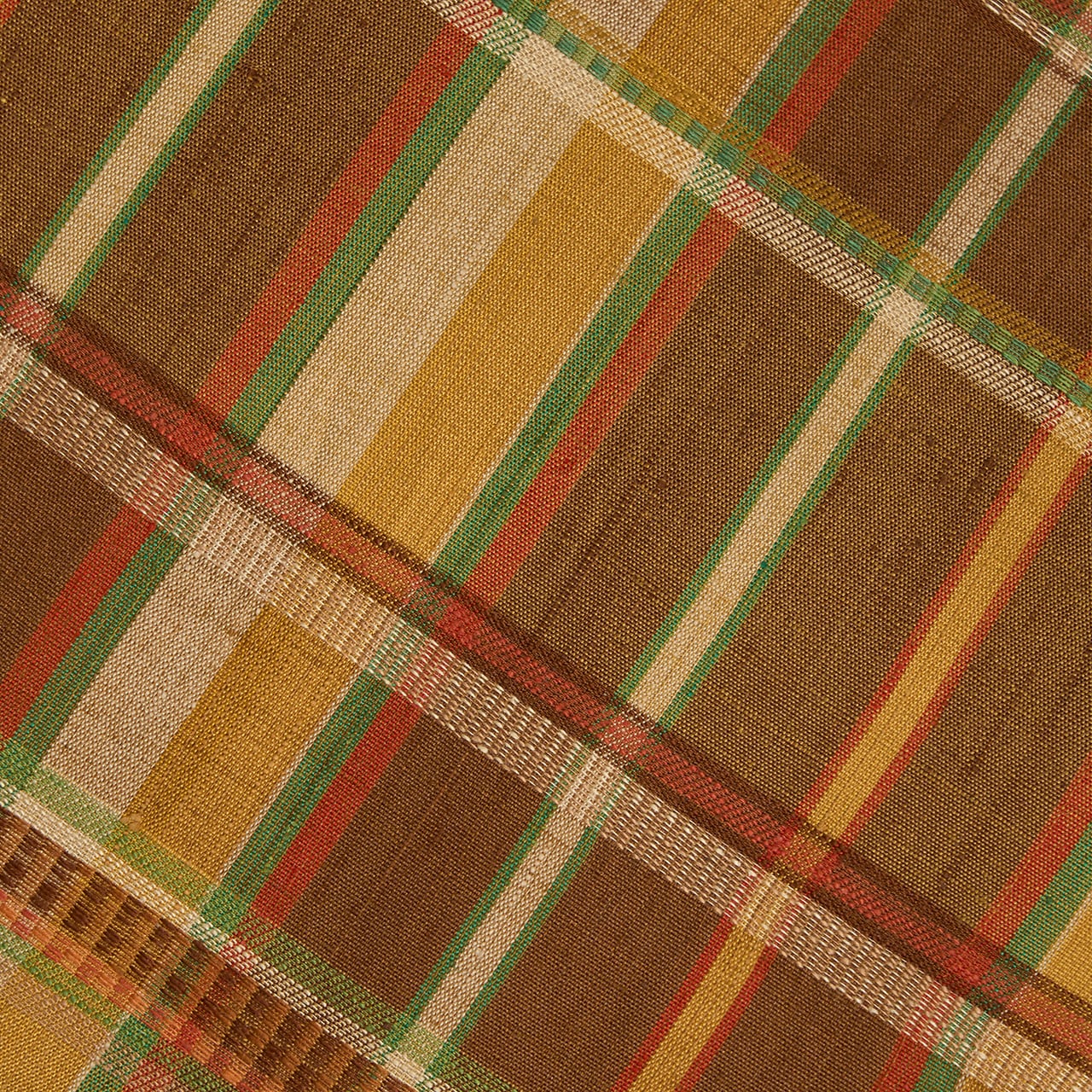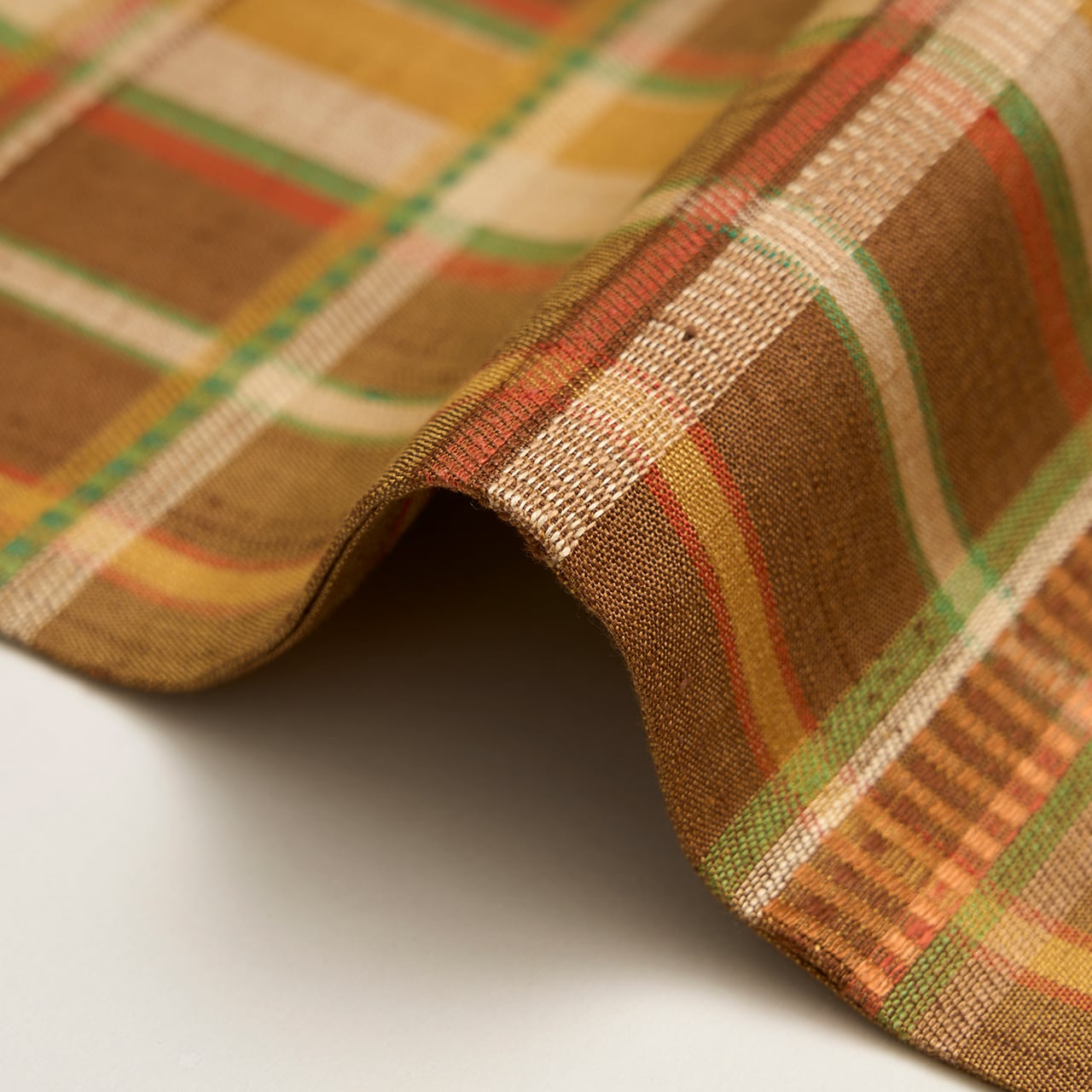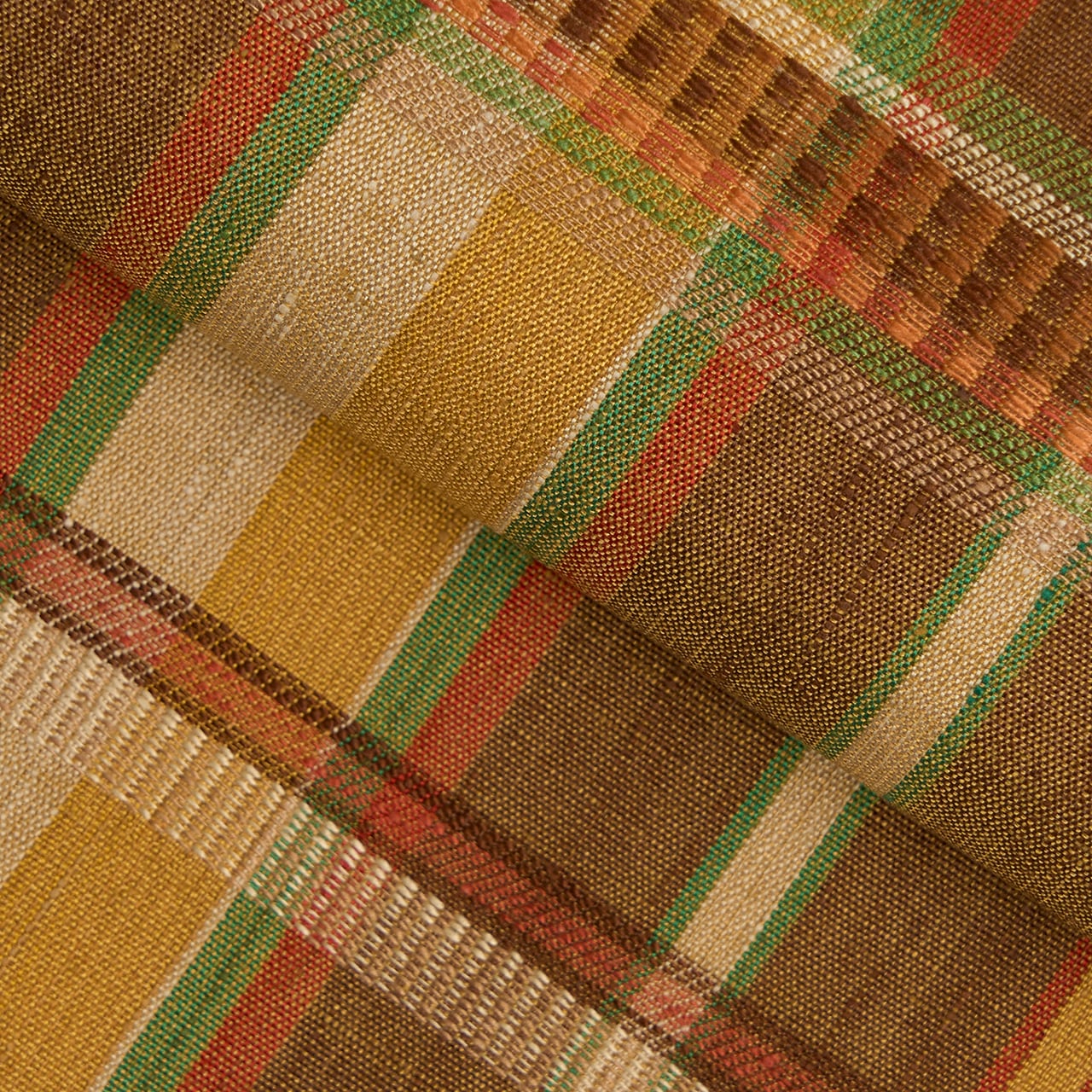 とても軽くシャリっとした質感の黄枯茶色の紬地に、山吹茶色、木賊色の草色、浅緋色の淡い朱色、亜麻色のベージュなどの糸で縦に縞模様が織り出され、横にも同じ色の糸で真田織や浮き織のような縞が織り出され、それが交差するような配置になって、とてもお洒落な模様を織りなしている素敵な紬の九寸名古屋帯です。