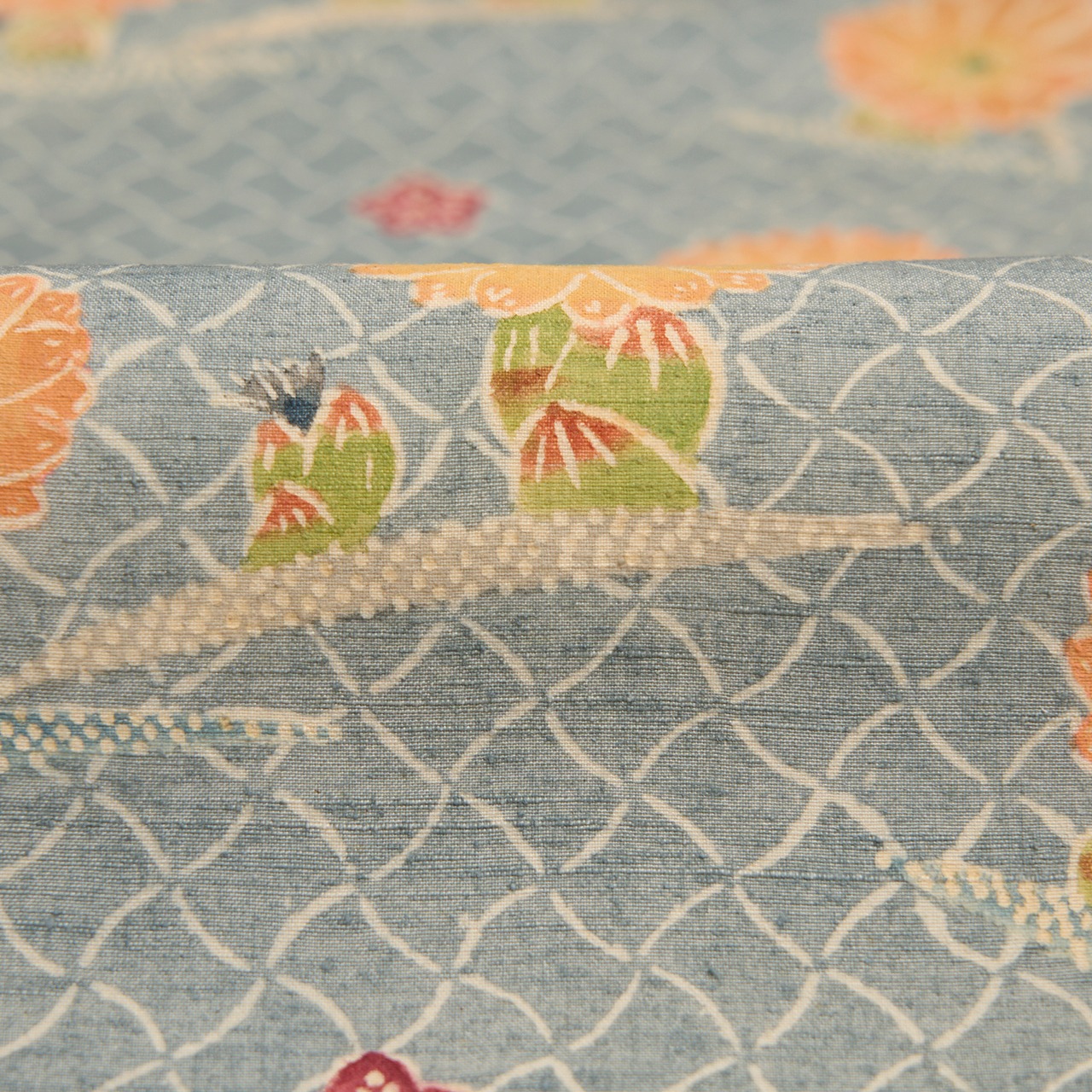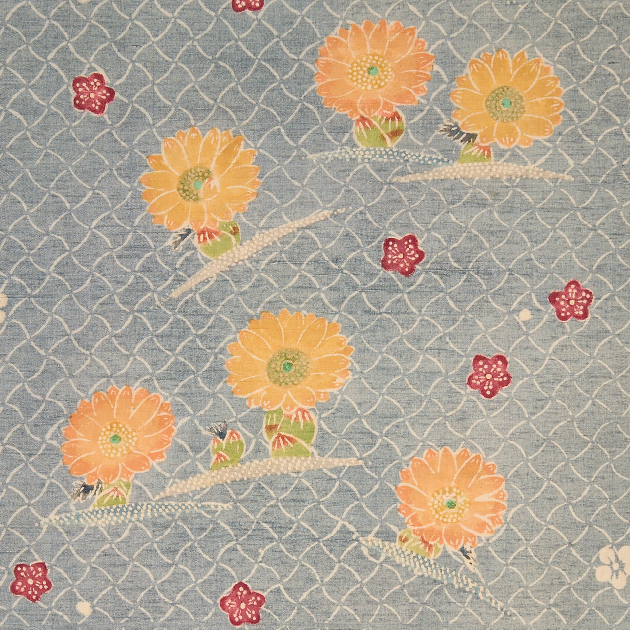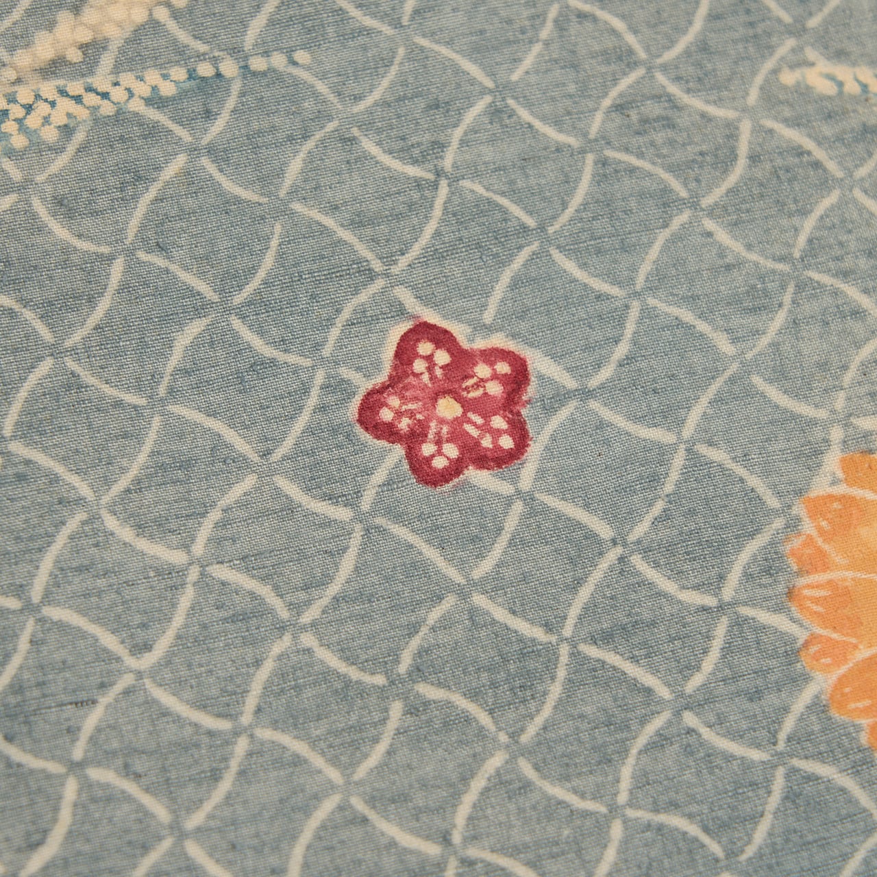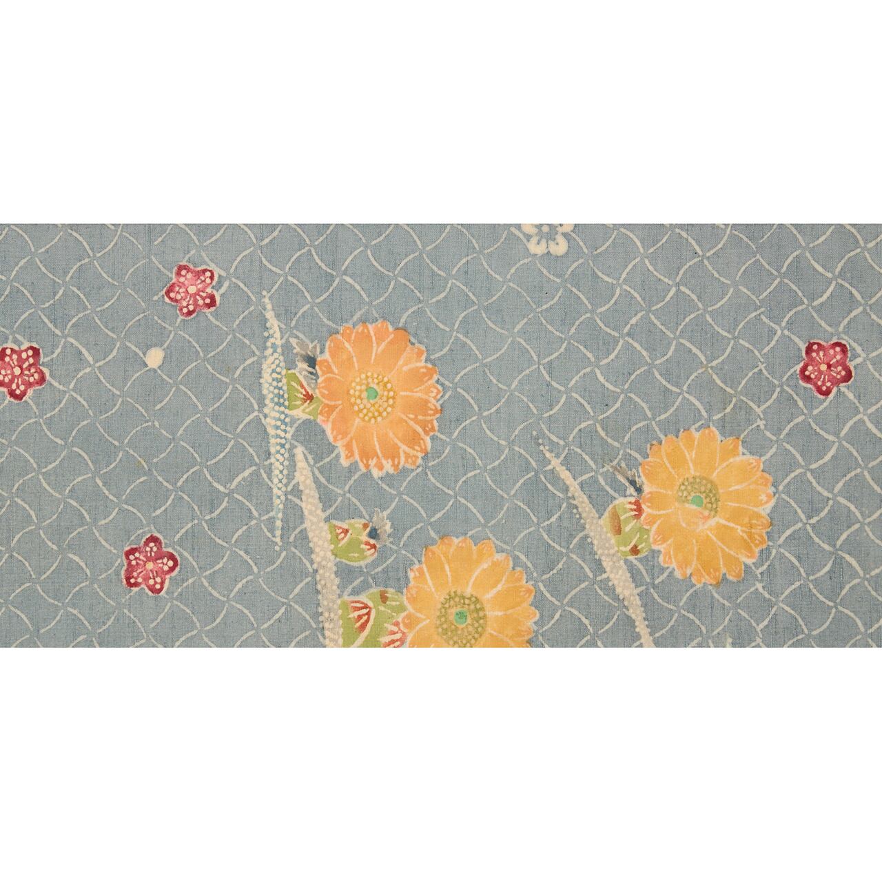 それぞれの表現の違いでの個性をご覧いただけるとまた楽しいのではないかと思います。きれいなシャーベットトーンの濃淡で染められたお花もチャーミングな印象となっていて、型絵染ならではの華やかな雰囲気が溢れています。