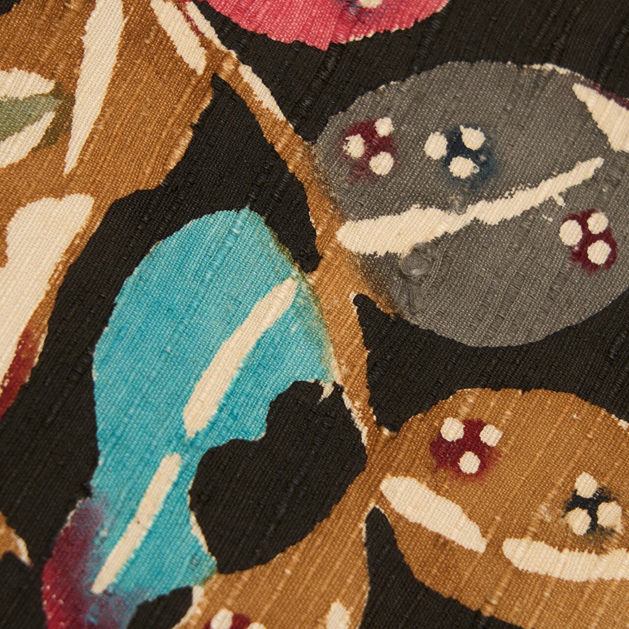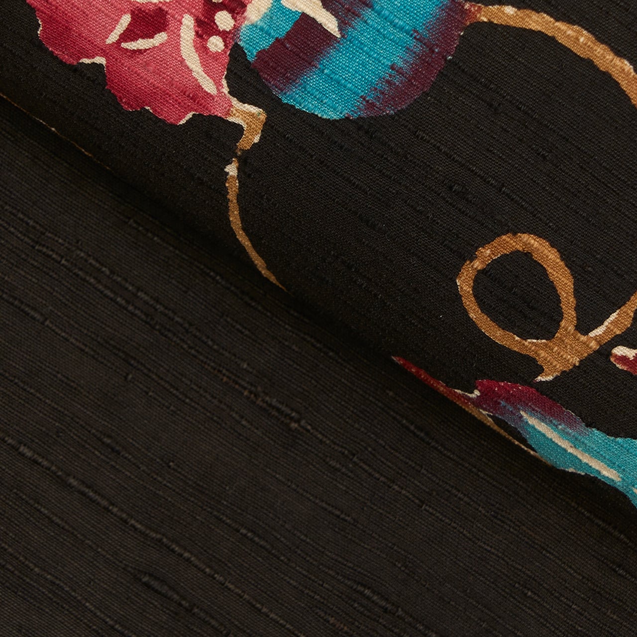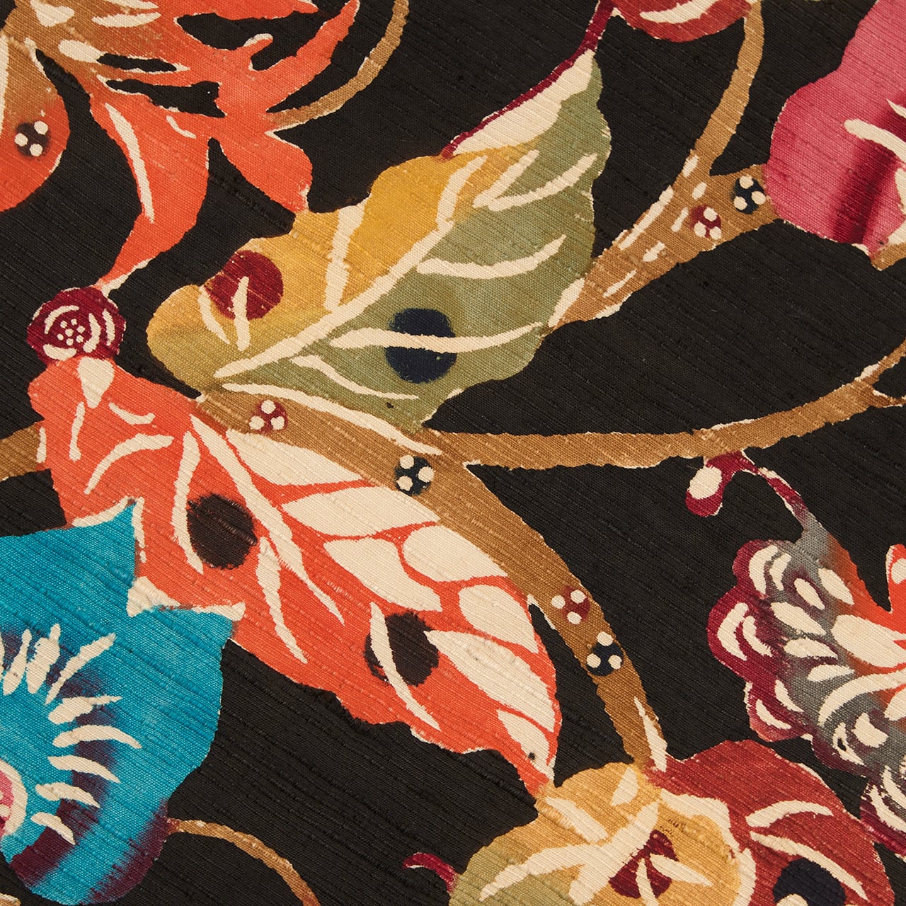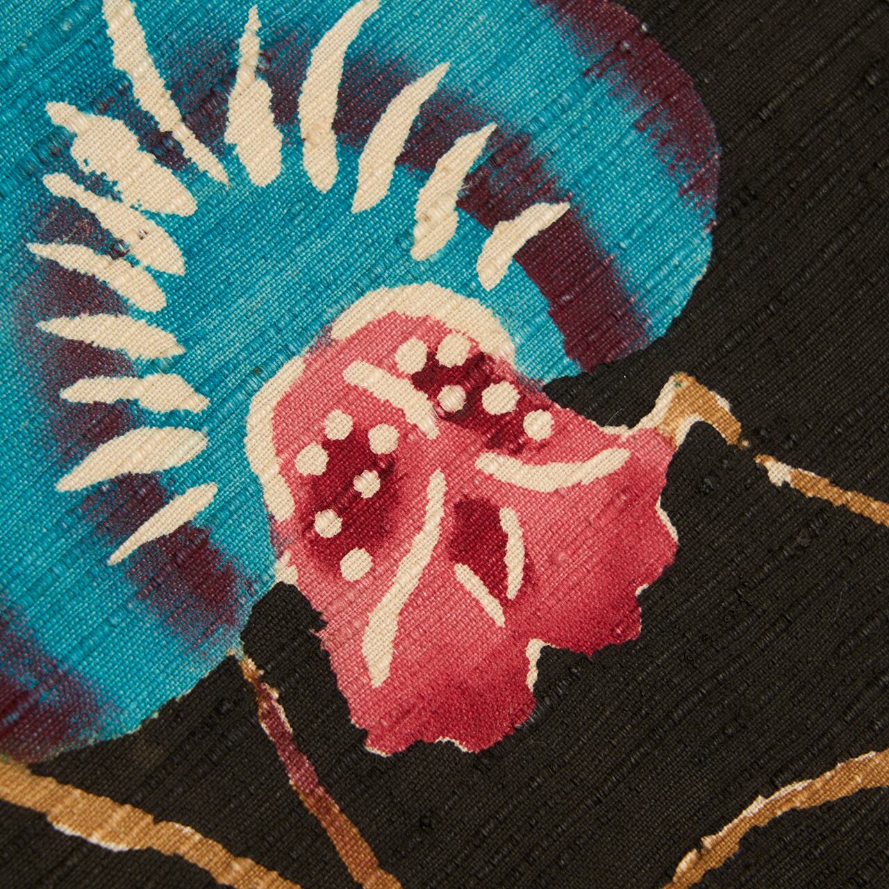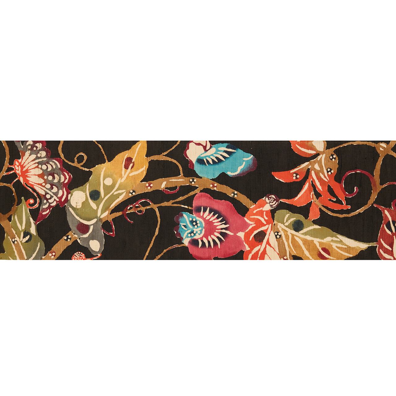 実際にはありえないのですが、同じ蔓から蘭のようなお花やデイゴのようなお花などが色とりどりに咲いて、それが型絵染ならではの顔料で鮮やかな色合いに染められ、躍動感のあるラインの蔓や葉も元気の良いフレッシュな雰囲気となっています。