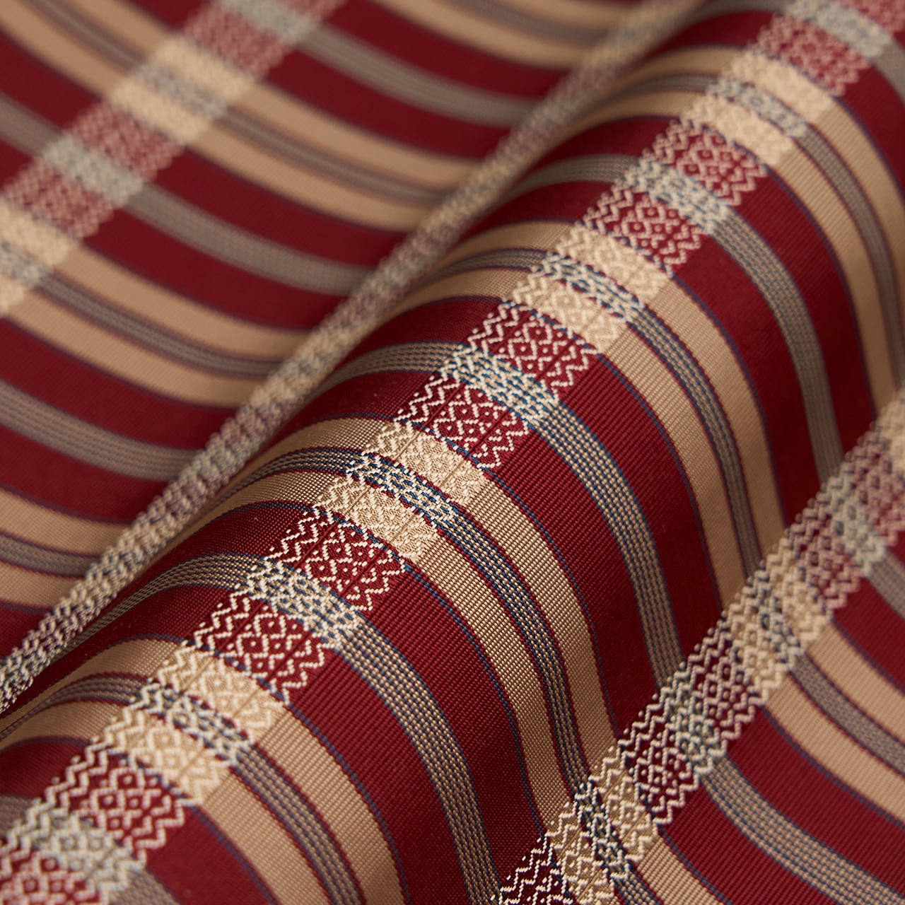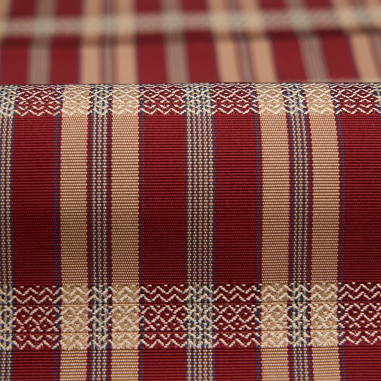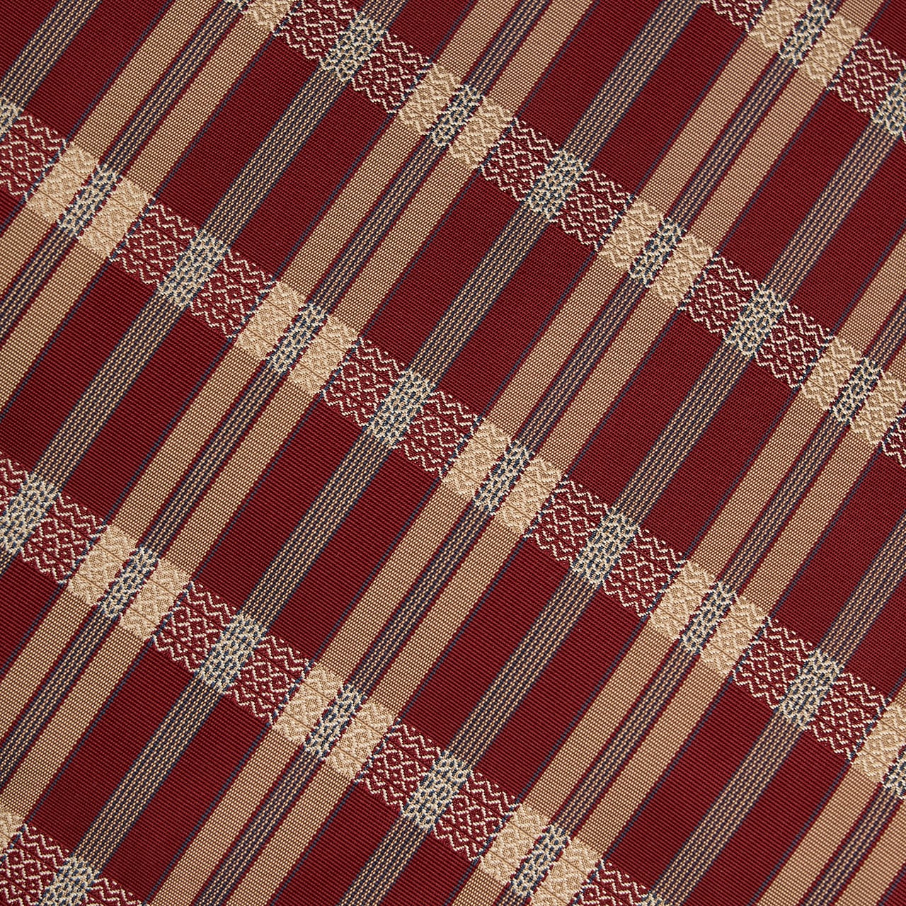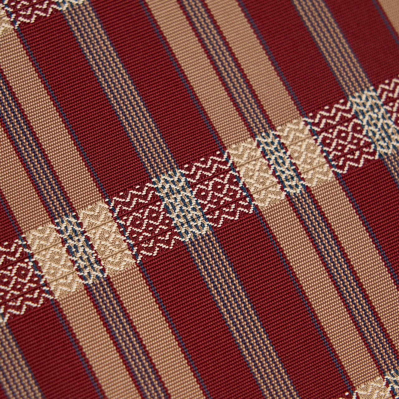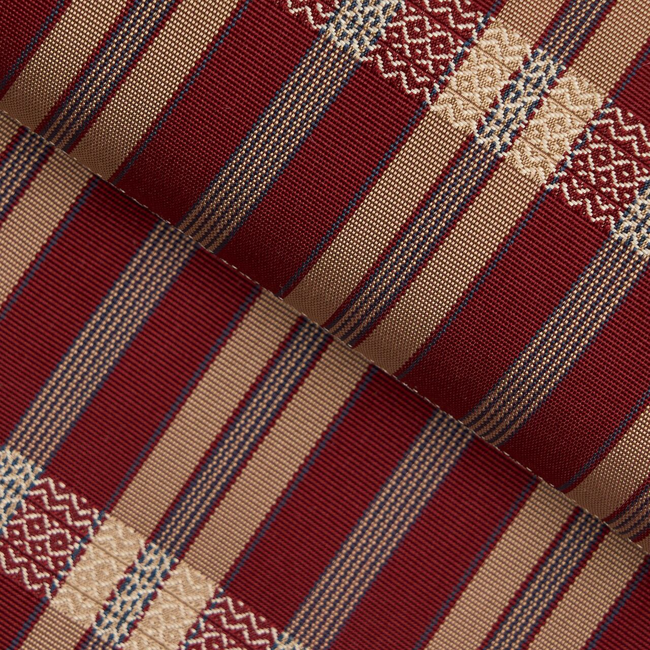 打ち込みの良いシャキッとした質感の葡萄茶色の地に、縦に亜麻色のベージュと湊鼠色の淡い藍色の間道手の縞が織り出され、横にはレースのようなジグザグの模様が織り込まれた、名物裂のひとつである鎌倉間道文様のお洒落な九寸名古屋帯です。