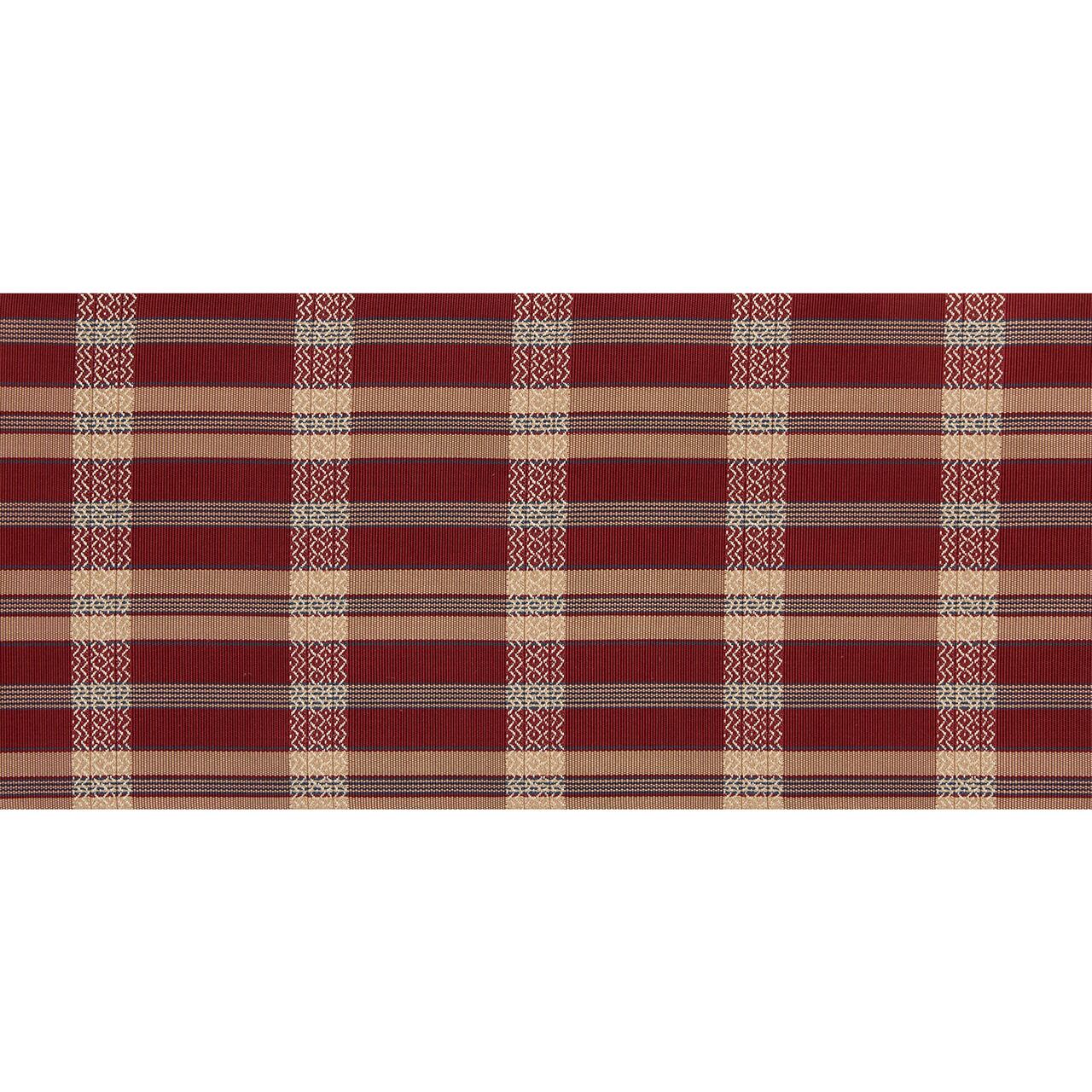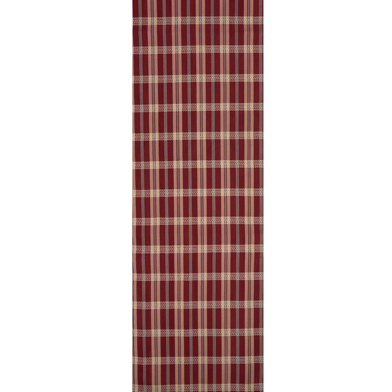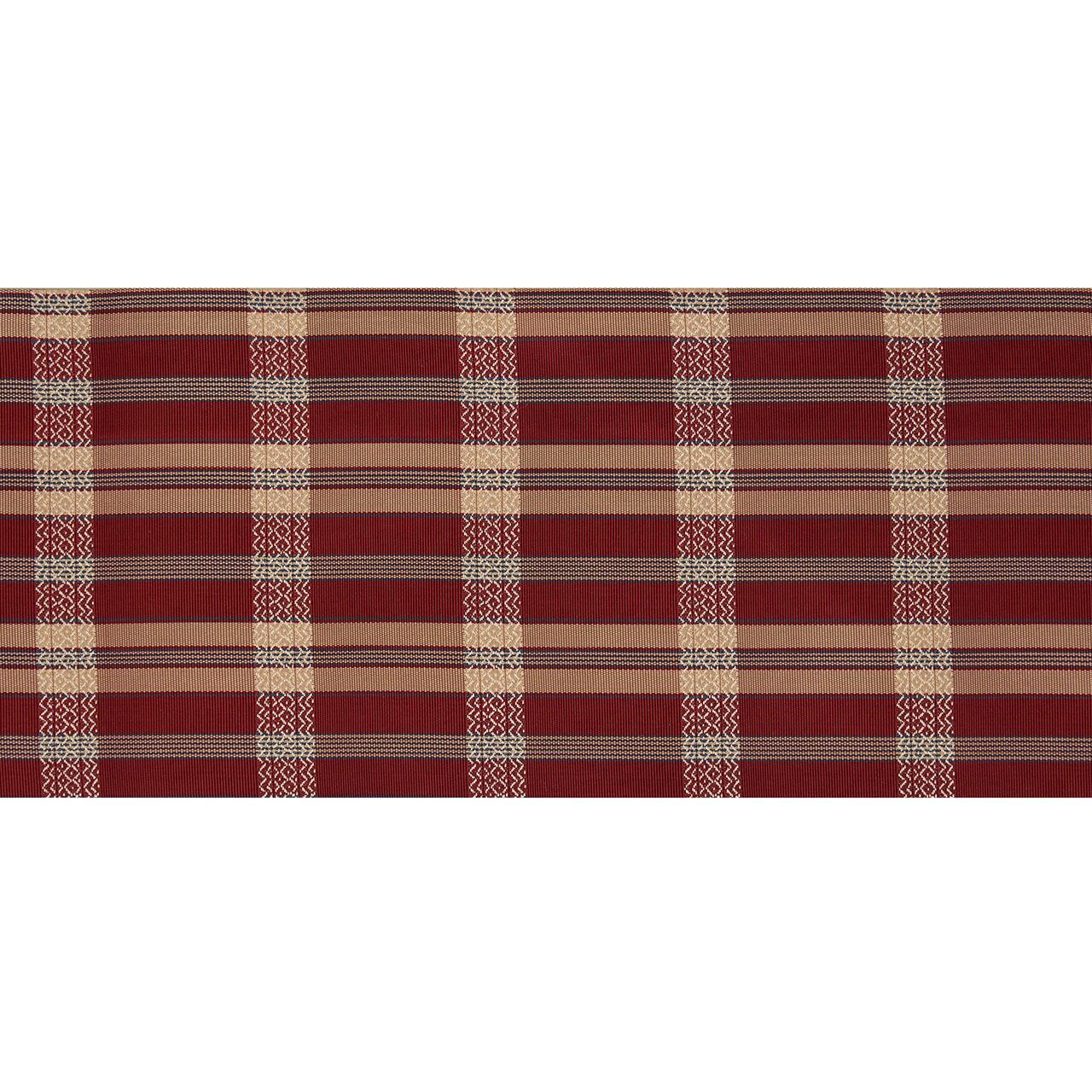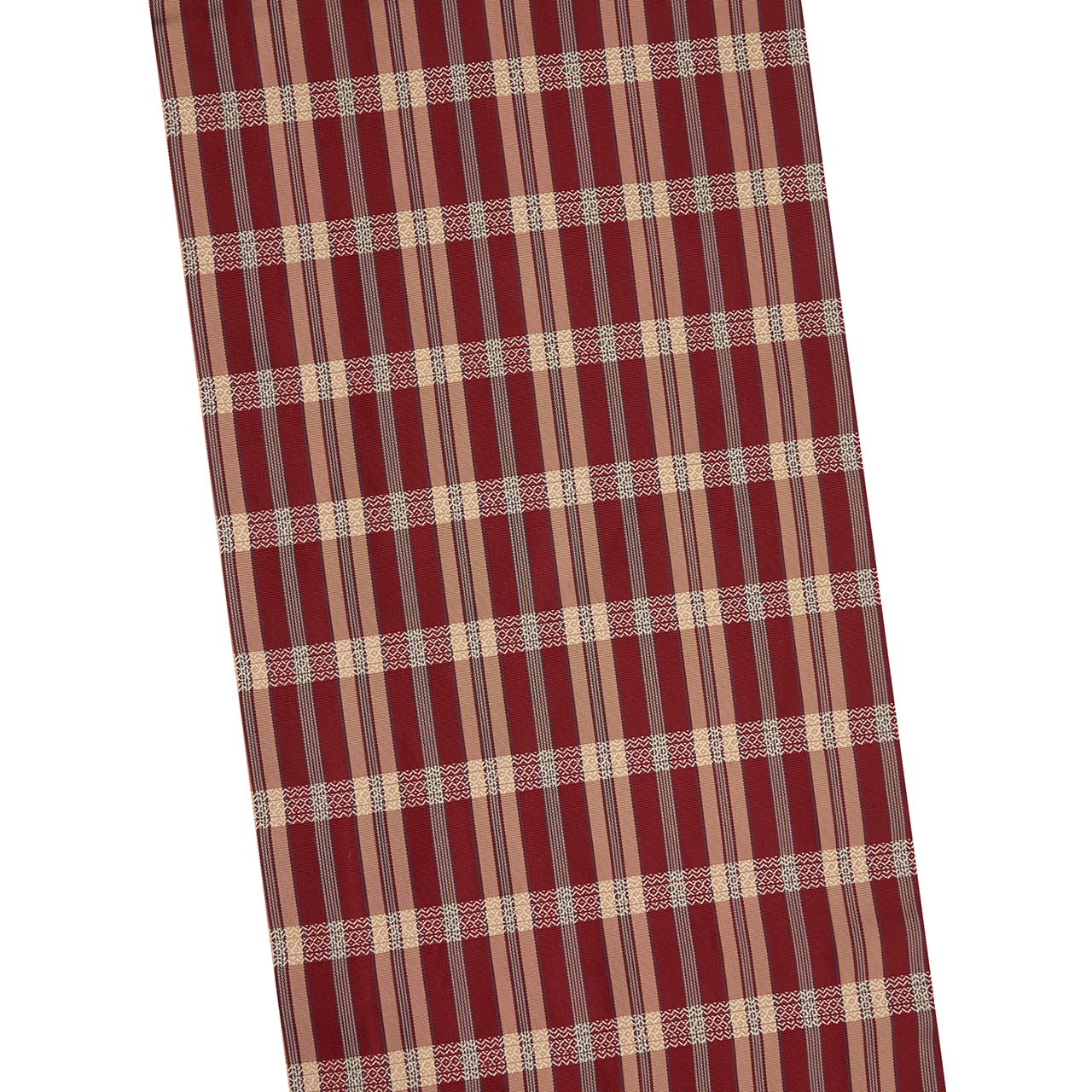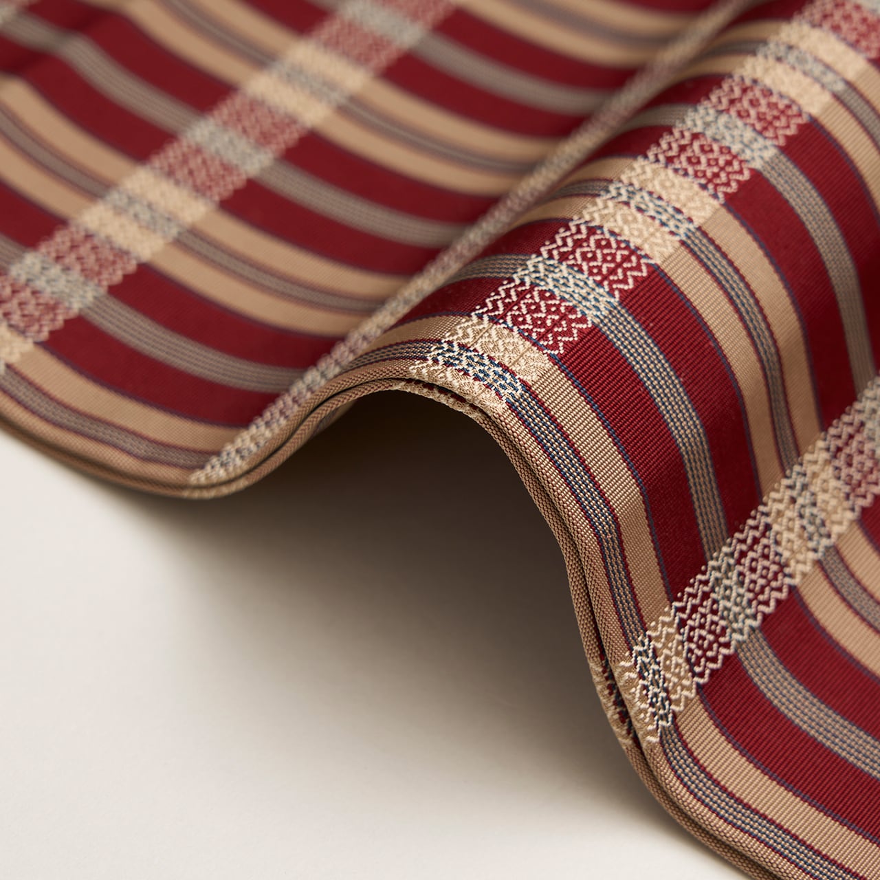 打ち込みの良いシャキッとした質感の葡萄茶色の地に、縦に亜麻色のベージュと湊鼠色の淡い藍色の間道手の縞が織り出され、横にはレースのようなジグザグの模様が織り込まれた、名物裂のひとつである鎌倉間道文様のお洒落な九寸名古屋帯です。