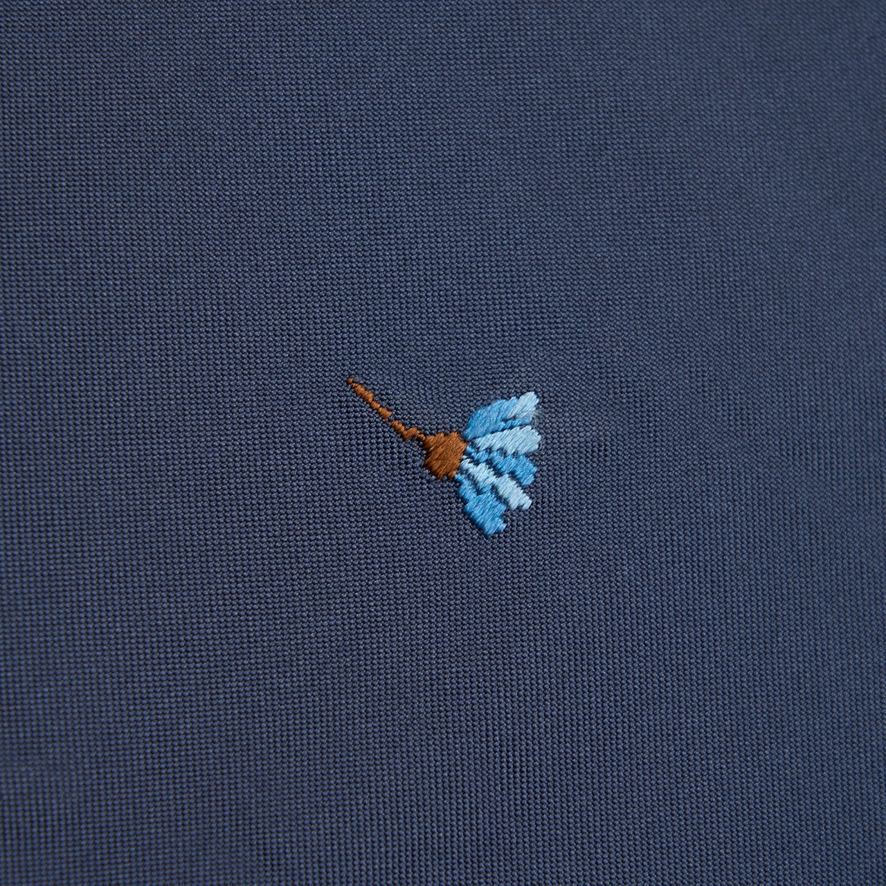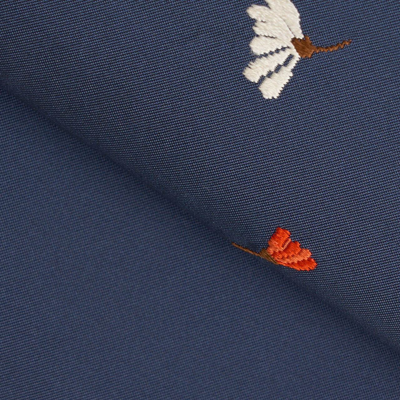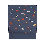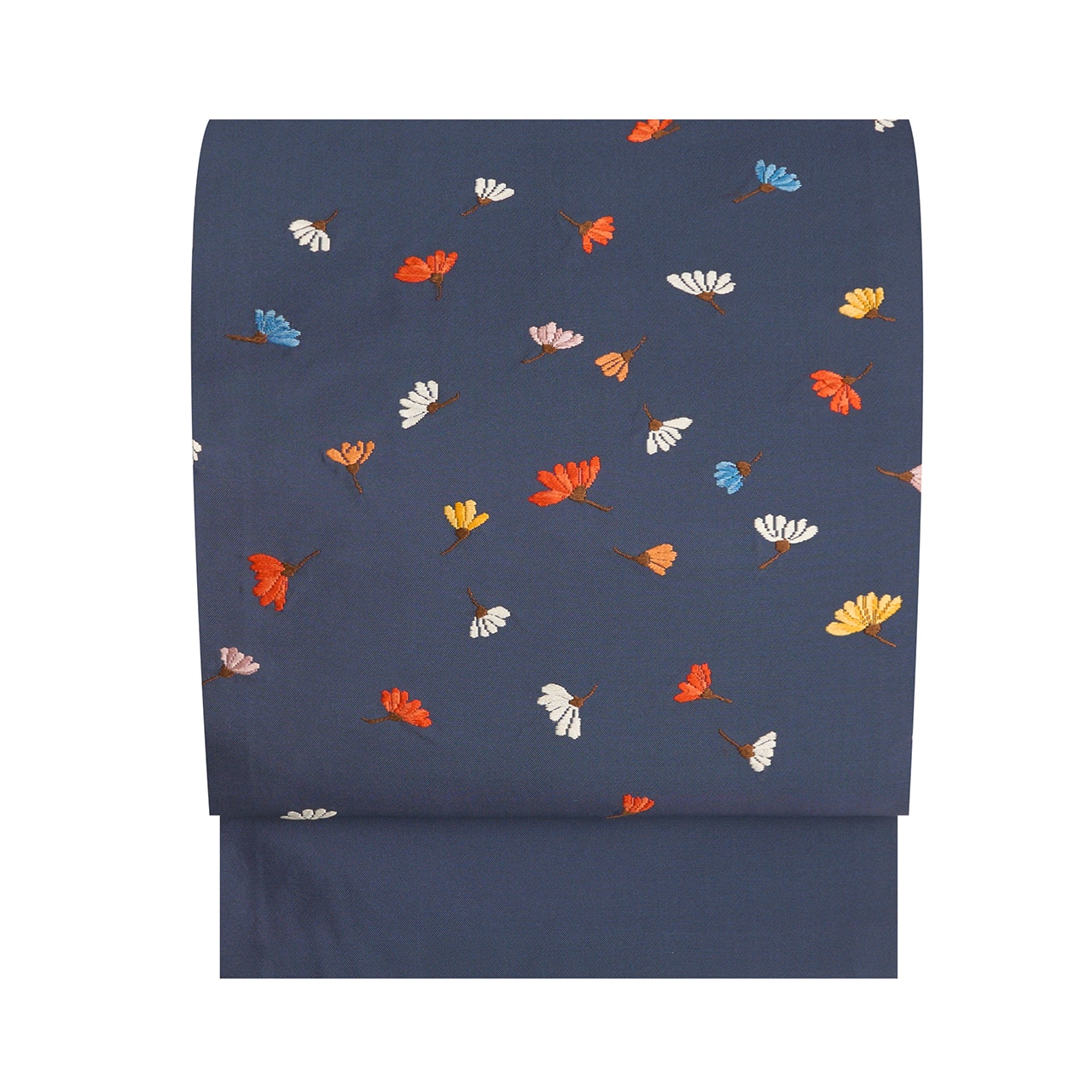 少しだけグレー味のある藍・青褐色のシャリっとした質感の生地に、深緋色の赤や鉛丹色のオレンジ、淡黄色の黄色、薄縹色のブルー、浅紫色など色とりどりの小さなお花が、一見刺繍に見えるような浮き織で散らされるようにたくさん織り出された、とても素敵な九寸名古屋帯です。