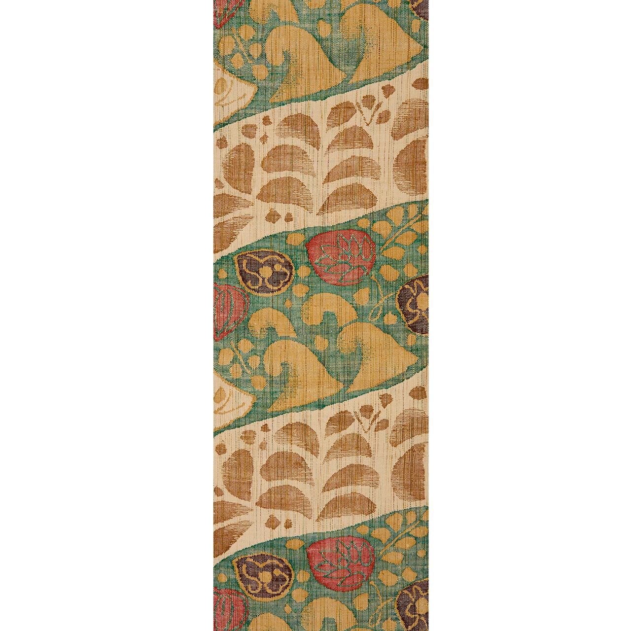 ざっくりとした風合いの砂色の紬地に、縦に緑青色と丁子染色の細い縞模様が織り出され、お太鼓には大きくやはり緑青色の枠が取られ、その中にうねる波と葵の葉が織り込まれ、まわりには藤の葉のような葉っぱが織り出された、大胆な模様が少しユーモラスな雰囲気になった、お洒落な八寸名古屋帯です。
