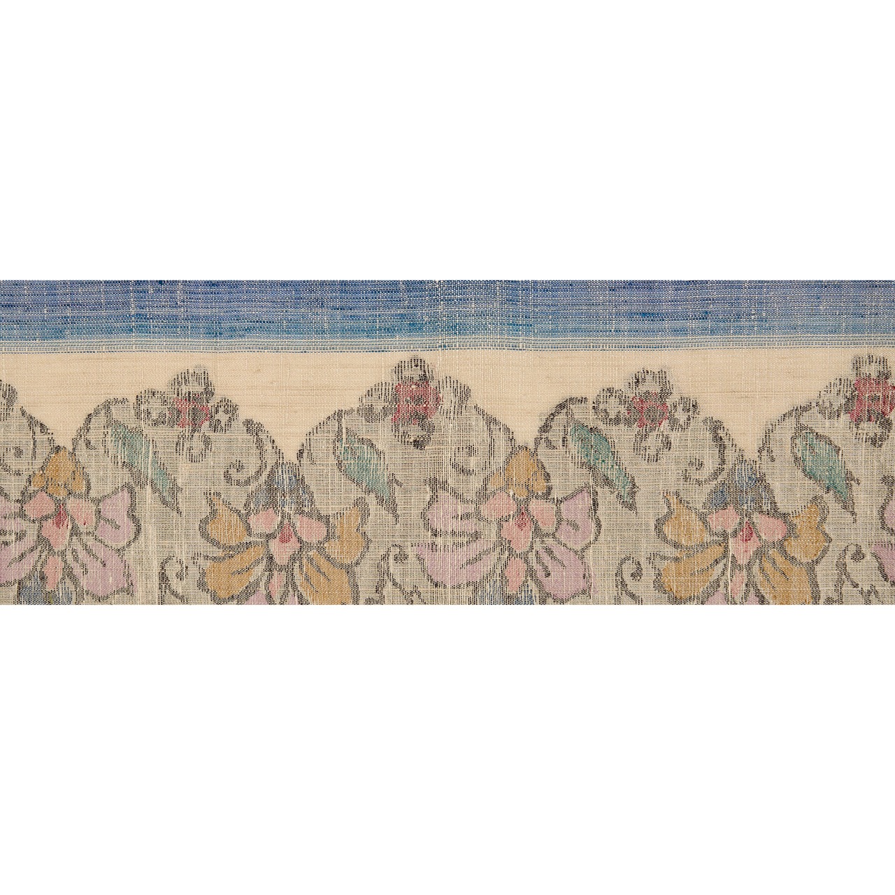 経緯に小さな節のあるサラッとした象牙色の紬地の、右側には約8cm、左側には約4cmのボーダーが織り出され、その間のお太鼓部分に花唐草模様がパステルトーンで織り出された、爽やかな印象の九寸名古屋帯です。