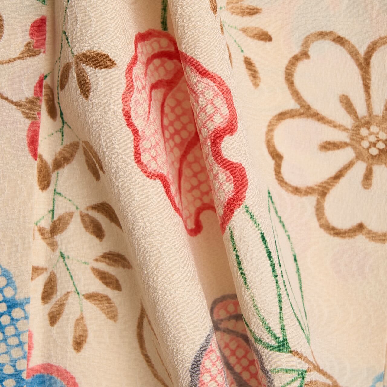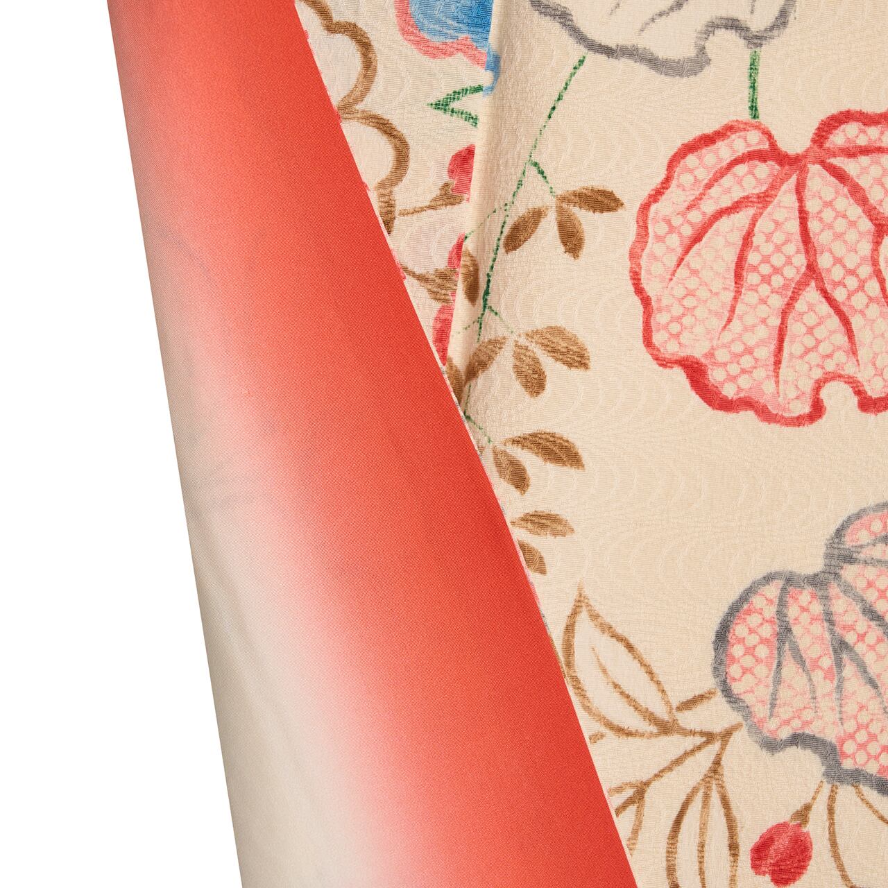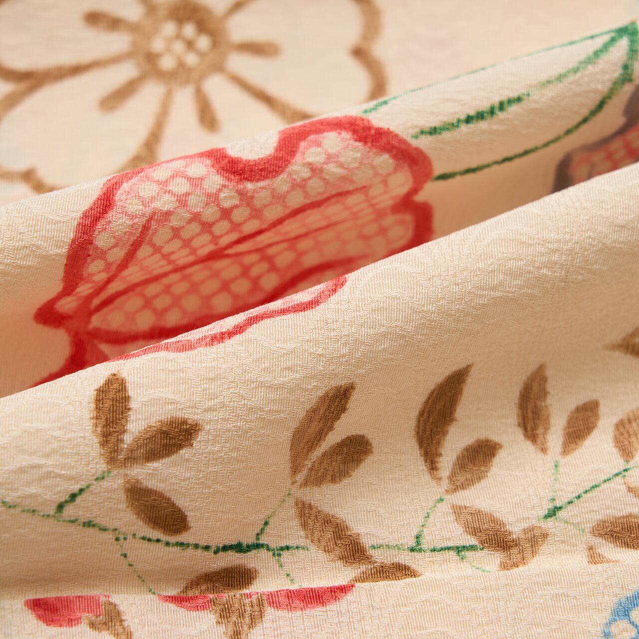 多ち花さんならではの独特の染色方法で染められているので、透明感のある発色となっていて、桜のお花やユキノシタの葉の部分に施された疋田の模様もとても綺麗で、無地部分なども手挿しで彩色されたようなニュアンスのある雰囲気となっています。