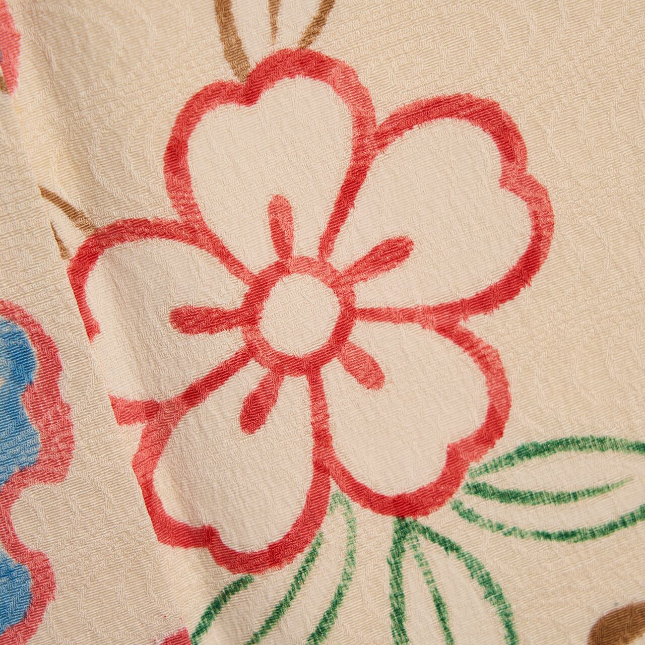 観世水のような流水の地紋が織られた紋意匠の練色の生地に、いろいろな色で桜のお花とユキノシタの葉と蕾のようなものが摺型友禅で染められた、とてもお洒落な雰囲気の小紋のお着物です。