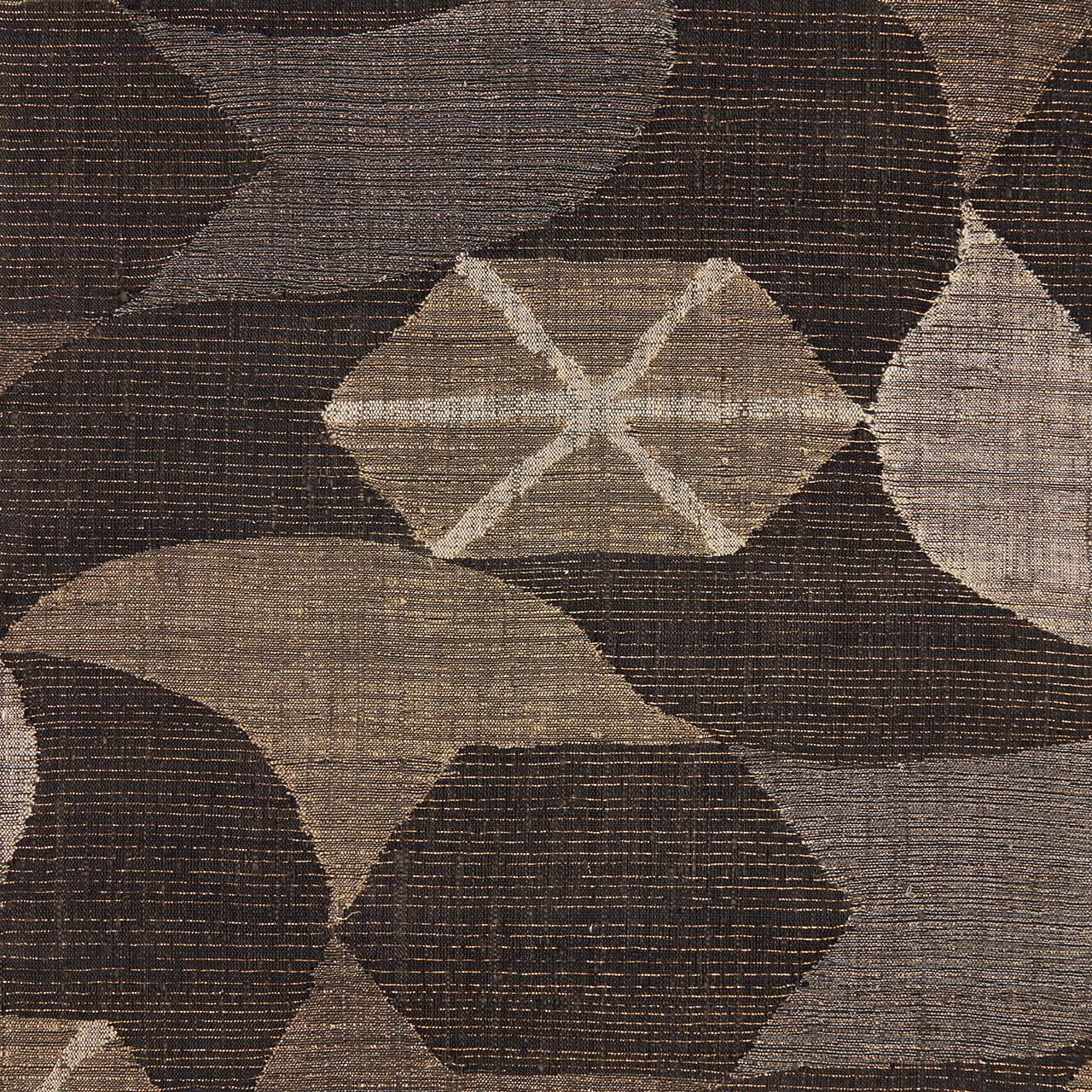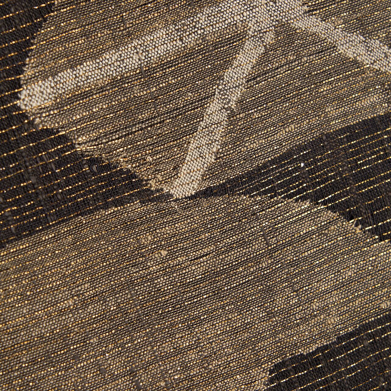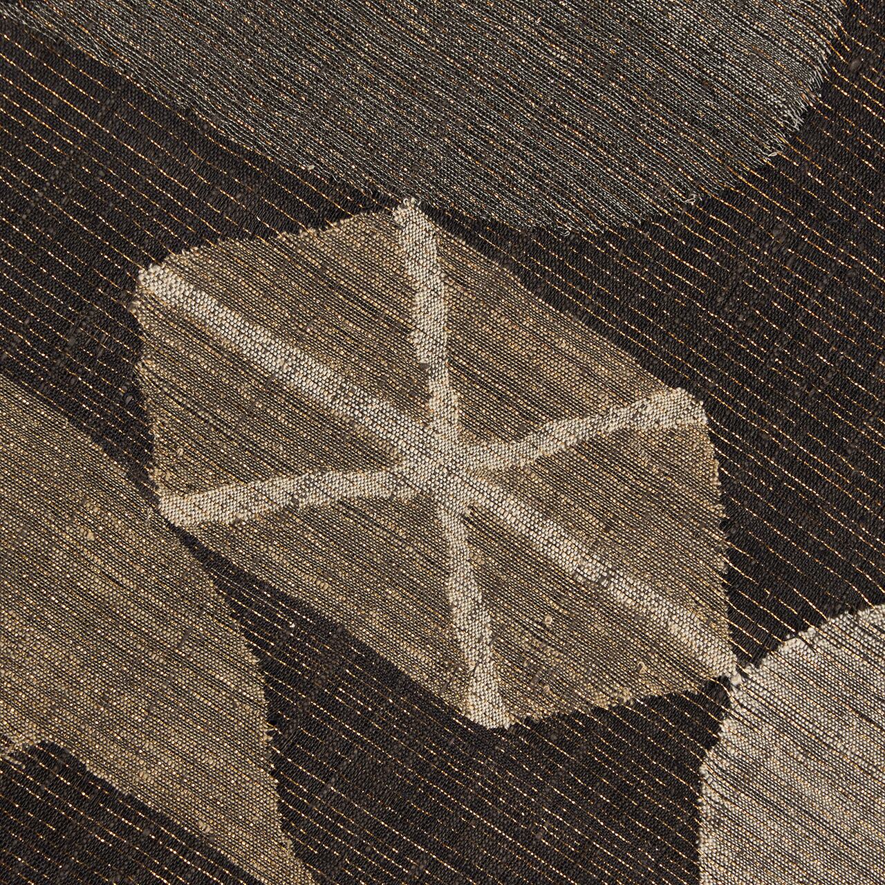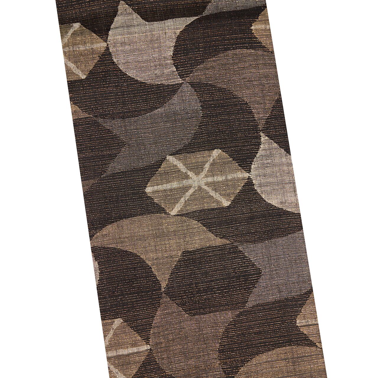 経緯に少し節のあるさっくりとした張りのある質感の赤墨色の紬地に、極細の金箔の糸が織り込まれた地金通しの生地に、利休白茶色や煤色、白鼠色、灰色などのグレーの同系色の糸で、大きめの風車のような模様や六角形に線が引かれた模様などの幾何学模様がすくい織で織り出された、とてもお洒落な雰囲気の袋帯です。