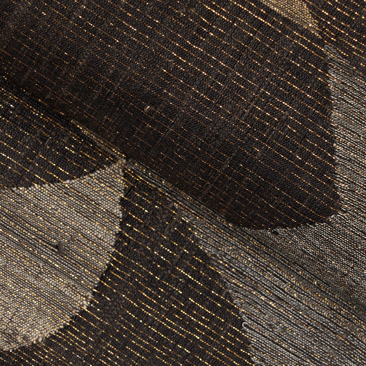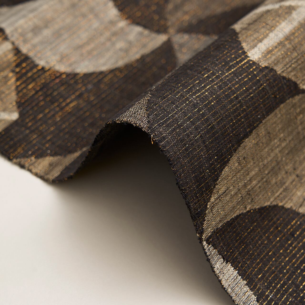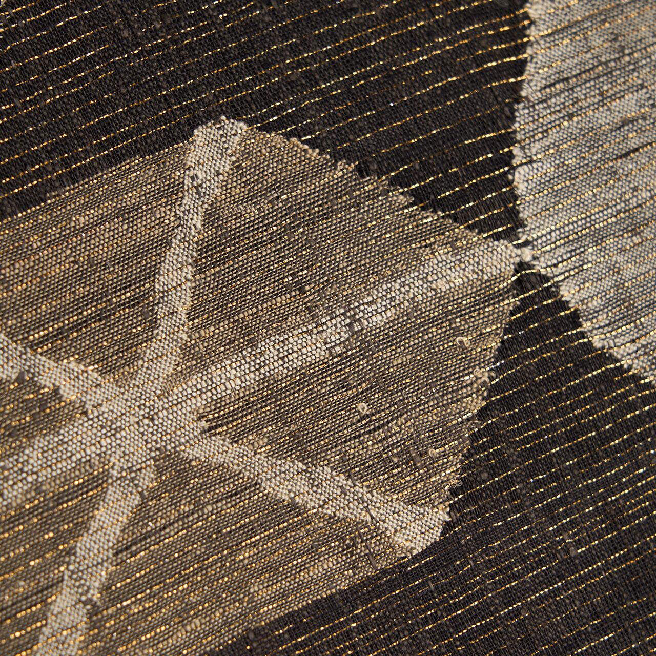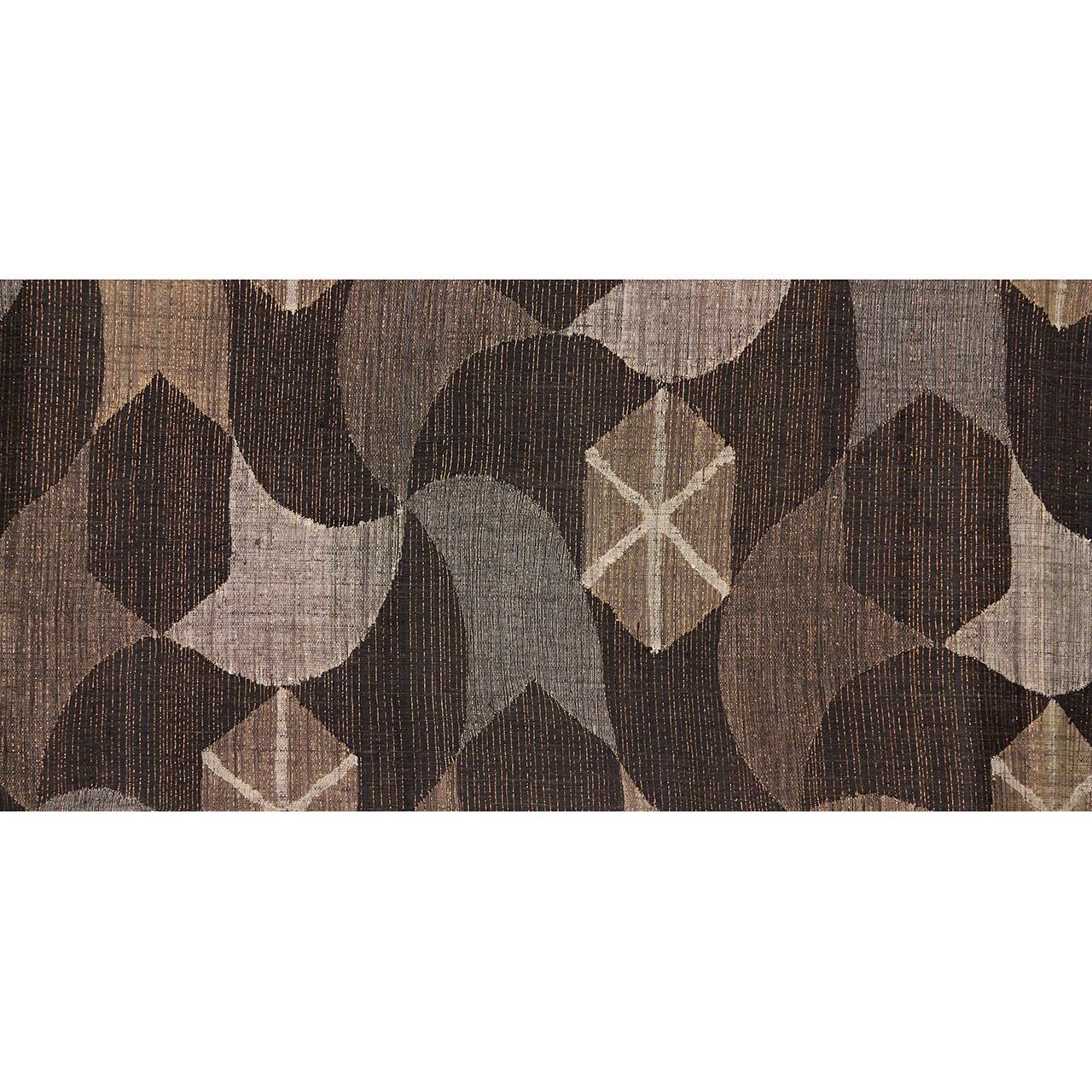 経緯に少し節のあるさっくりとした張りのある質感の赤墨色の紬地に、極細の金箔の糸が織り込まれた地金通しの生地に、利休白茶色や煤色、白鼠色、灰色などのグレーの同系色の糸で、大きめの風車のような模様や六角形に線が引かれた模様などの幾何学模様がすくい織で織り出された、とてもお洒落な雰囲気の袋帯です。