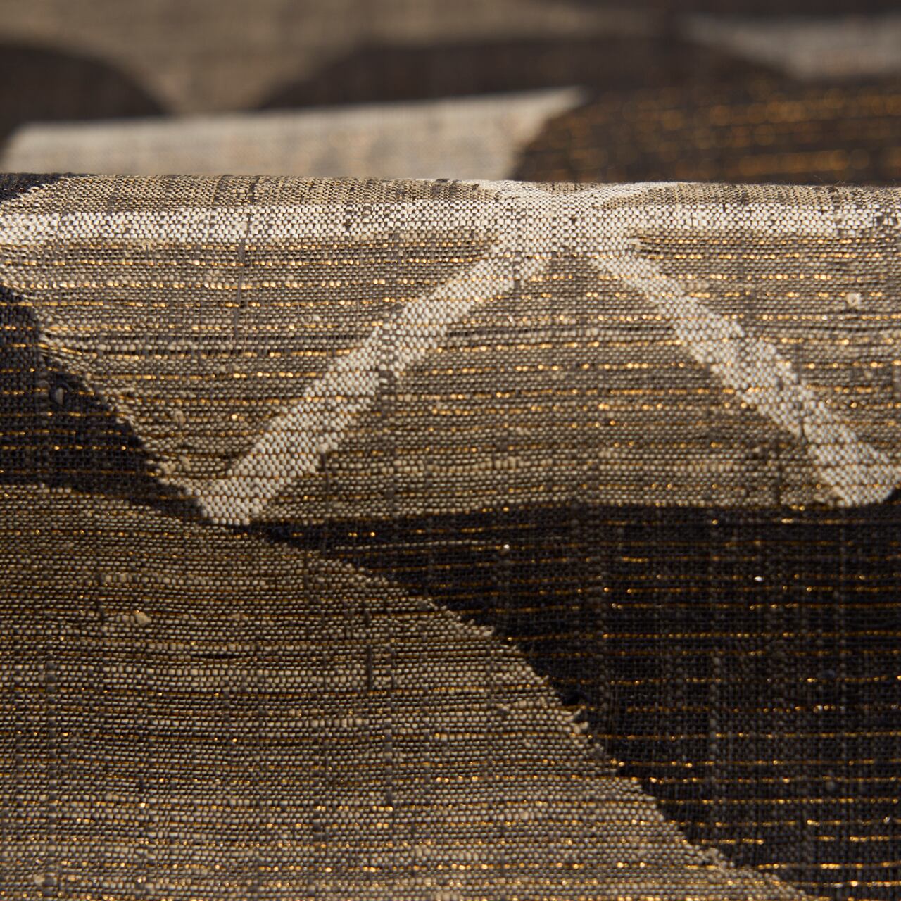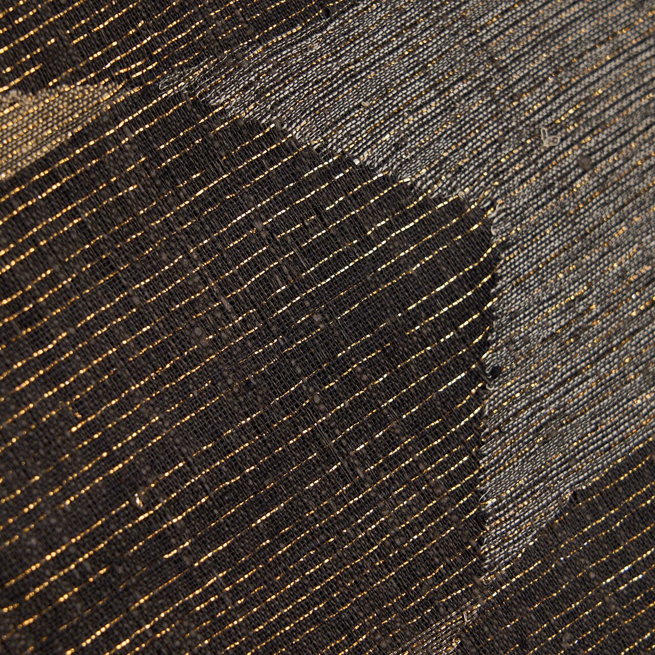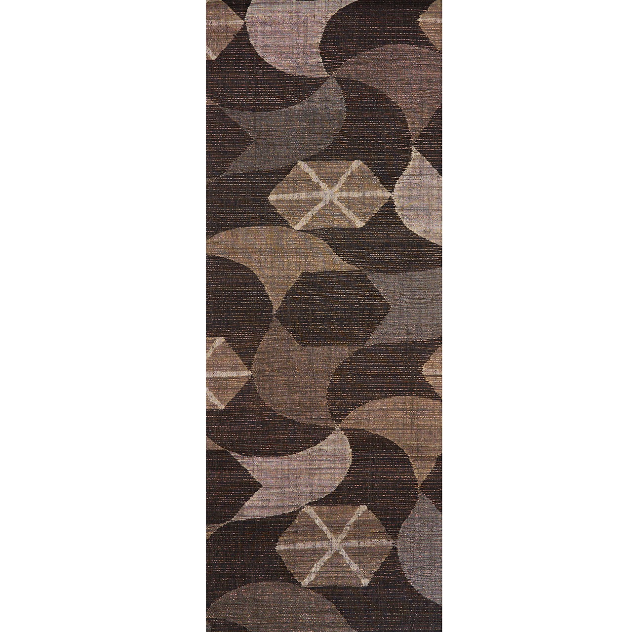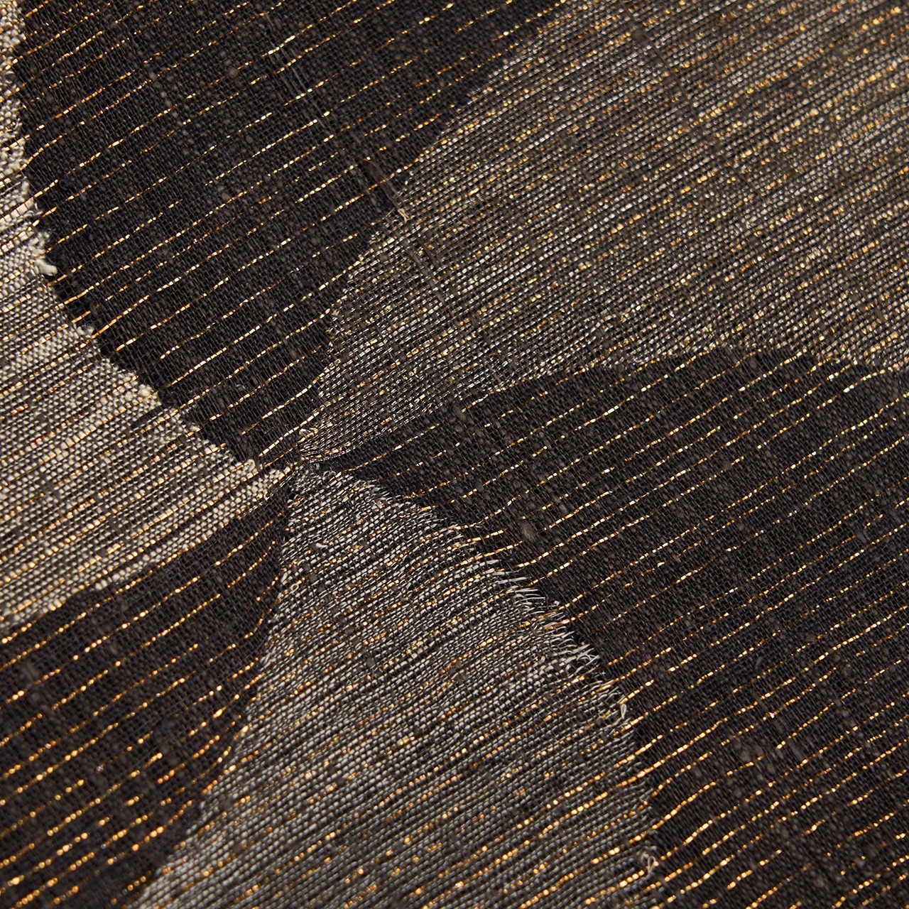 経緯に少し節のあるさっくりとした張りのある質感の赤墨色の紬地に、極細の金箔の糸が織り込まれた地金通しの生地に、利休白茶色や煤色、白鼠色、灰色などのグレーの同系色の糸で、大きめの風車のような模様や六角形に線が引かれた模様などの幾何学模様がすくい織で織り出された、とてもお洒落な雰囲気の袋帯です。
