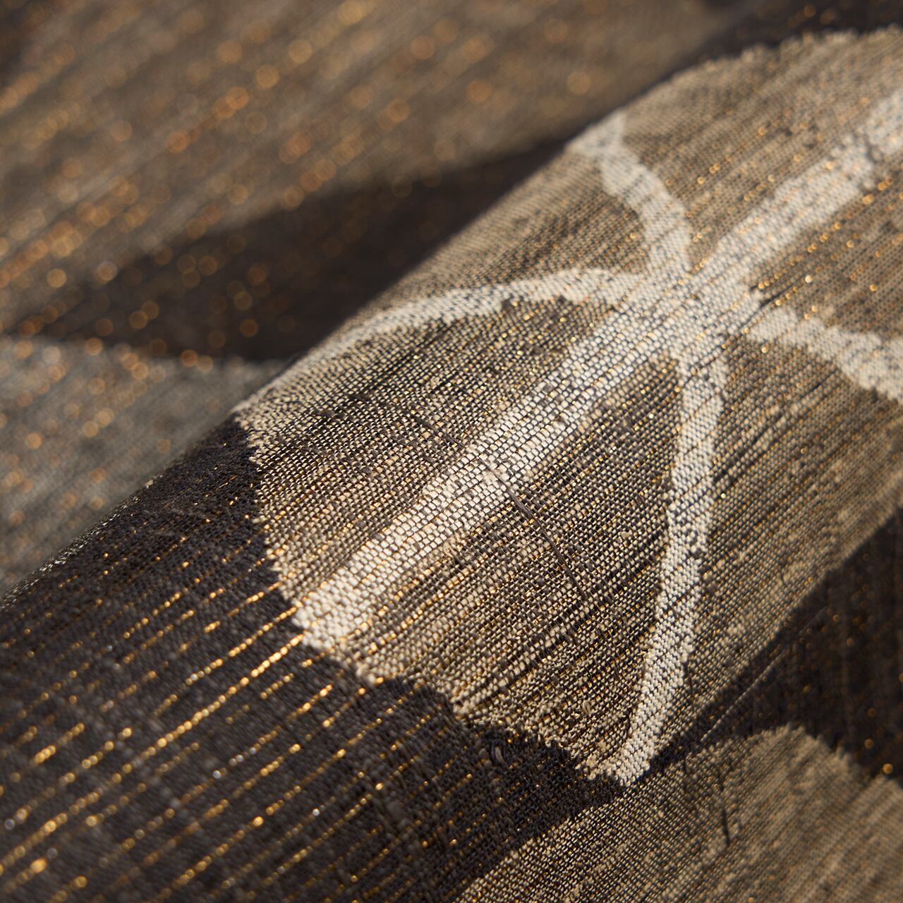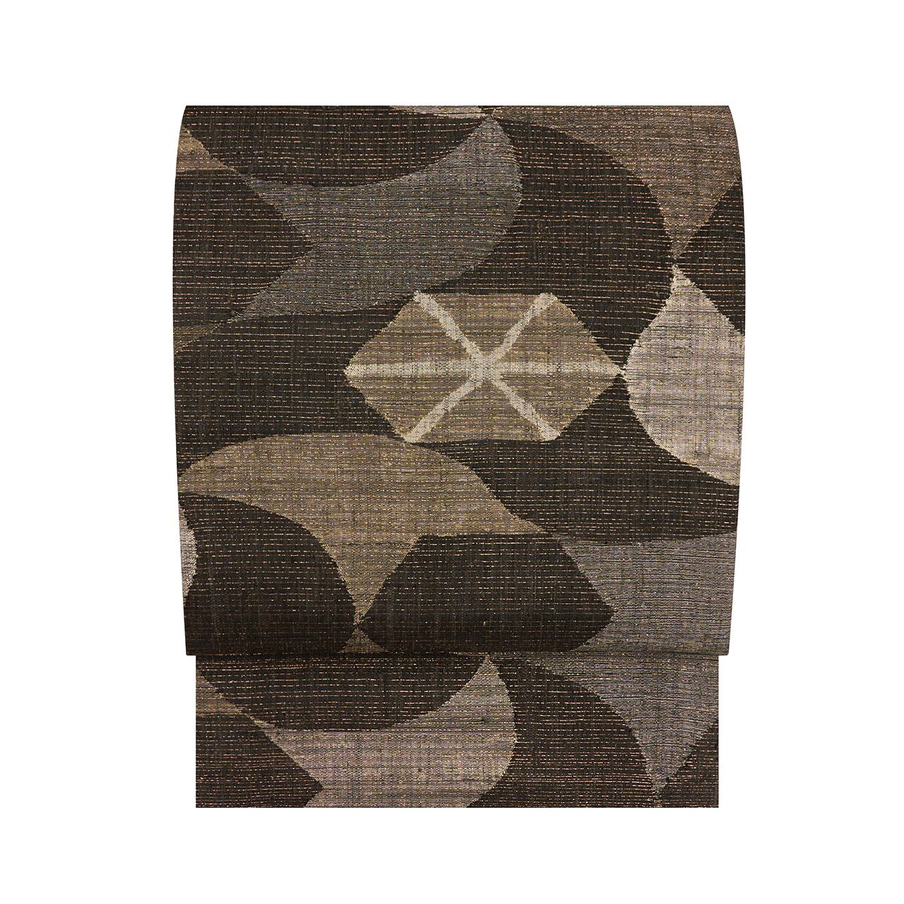 大胆なデザインの模様が織られていますが、モノトーン的な色使いで表されていて、すっきりとしたクールな印象の帯となっています。