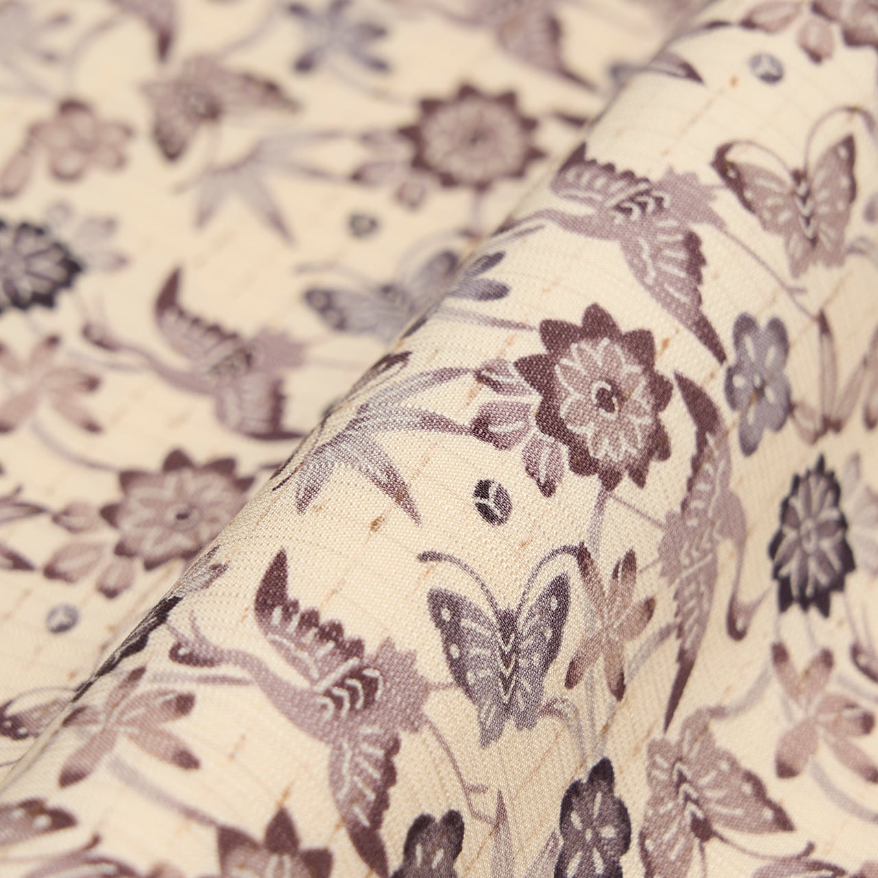 やさしいモノトーンの色合いで可愛らしいお花や蝶々が紅型調に染められて、程よい民芸色もあり、素敵な着こなしをお楽しみいただけると思える、大変おすすめの一点です。
