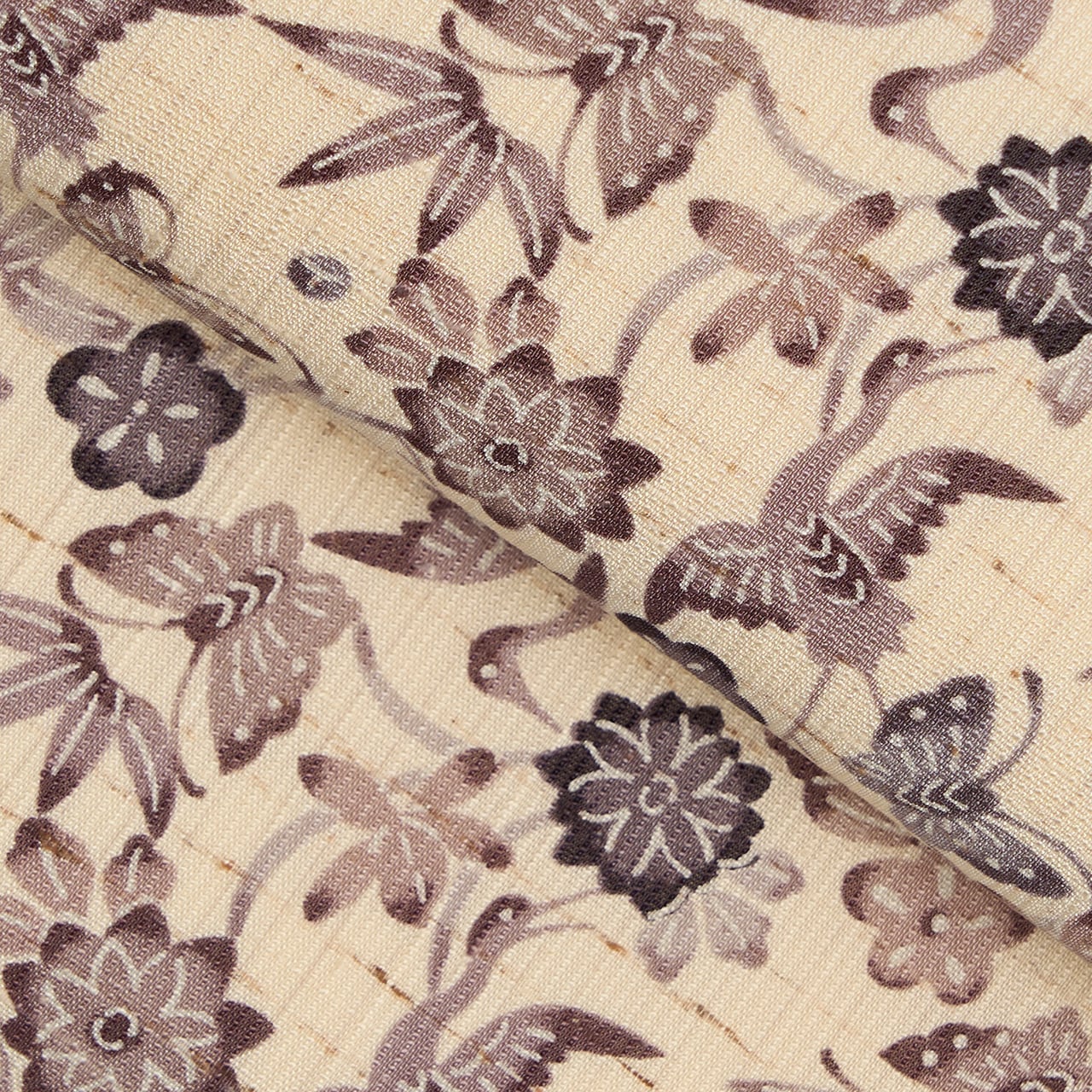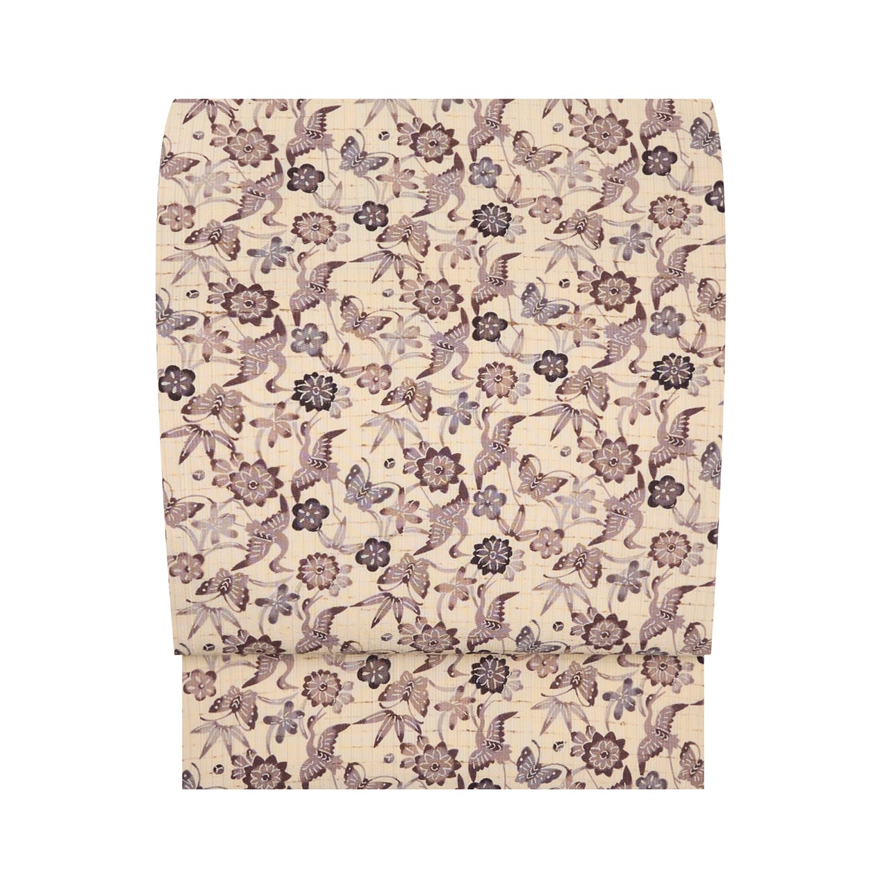 縦に少し節のあるシャリっとしていながら柔らかい質感の地に、横糸には約1cmおきにぜんまいの綿が織り込まれたぜんまい紬の生地に、桜や梅、笹、菊、春蘭のお花と、その間には鶴や蝶々があしらわれた、シックな色使いが素敵な紅型調の染めの九寸名古屋帯です。