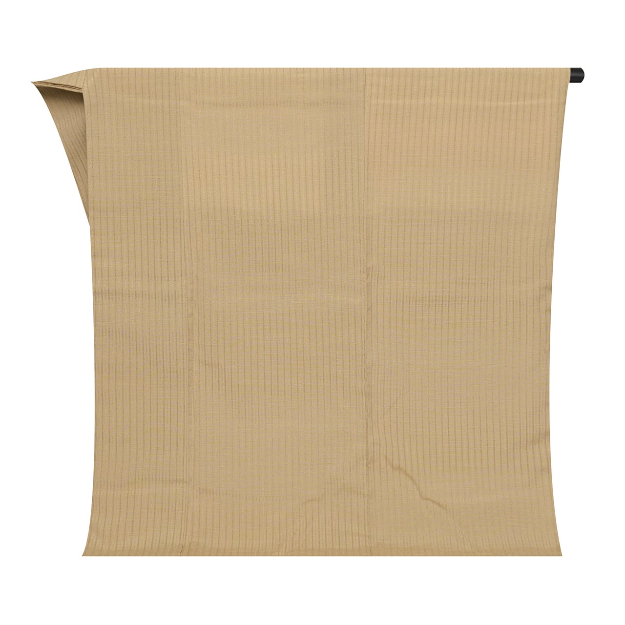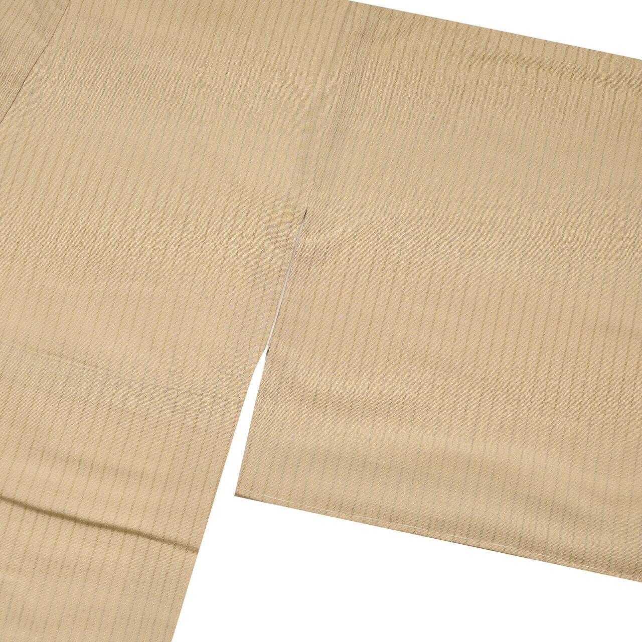 小千谷の絹ちぢみの弾力性のある亜麻色の生地に、樋口さんならではの独特の縞の模様が織り出され、少し凹凸感のある質感となっているのも個性的で、とても魅力的な素敵なお着物となっています。