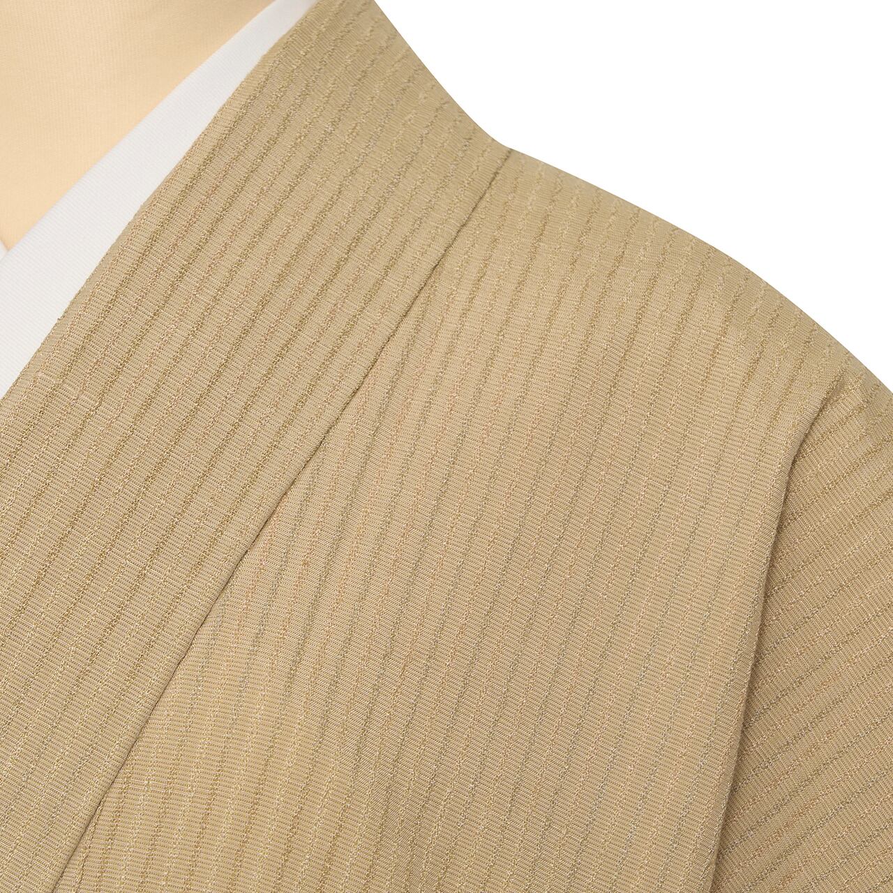 撚りの強い緯糸を使用して織られた絹ちぢみの亜麻色の生地に、淡いグレー・利休白茶色と淡いピンク・灰梅色の細縞が交互に配置して織り出された、とてもお洒落なお着物です。