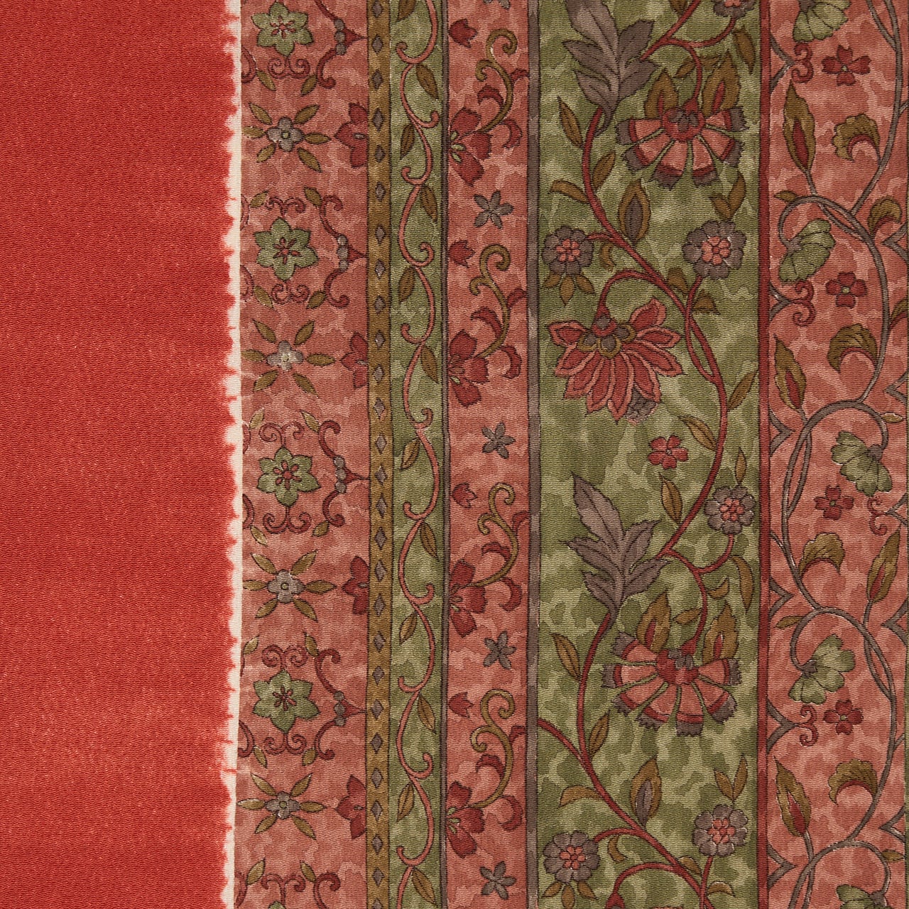 右側の更紗模様の部分は、革色のくすんだ緑と、蘇芳香色の渋めのピンクで縞のように染め分けられ、大きめのお花が蔓になったものや、小さなスミレのようなお花の蔓など、いろいろなパターンで描かれていて、地染めは手挿しで色付けされて、とても凝ったものとなっています。