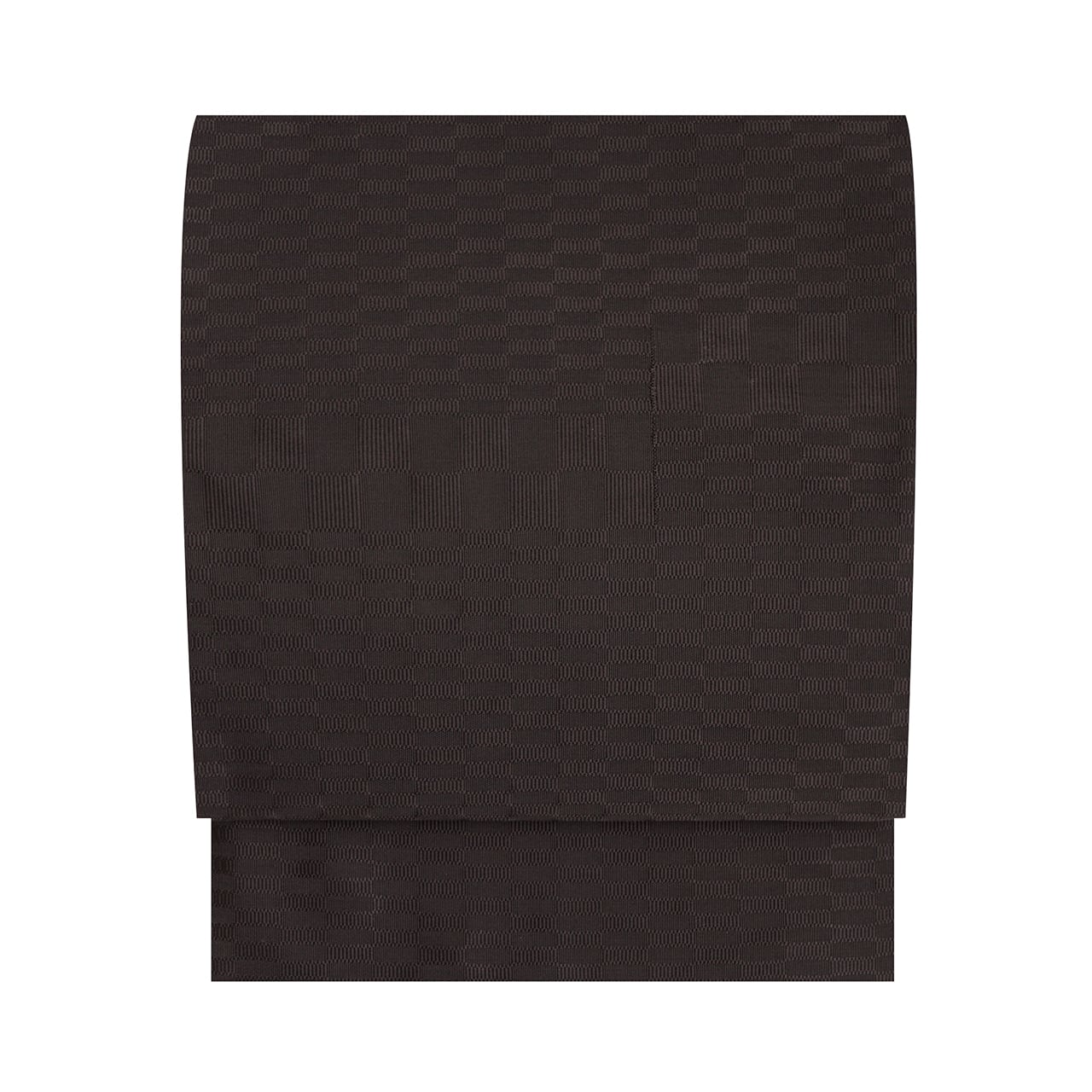少しだけ赤味のあるこげ茶・赤墨色のやや太めの糸で、全体に市松の配置に横向きの真田織が織り出され、お太鼓の一部にはそれが大きく取られて、ちょっとしたアクセントとなっているような変り織にされた、お洒落な雰囲気の草木染の無地の八寸名古屋帯です。