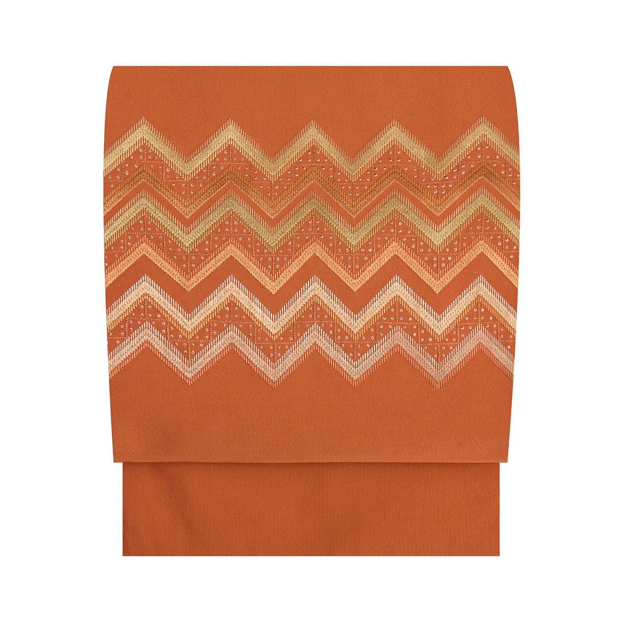 しっかりとした手織りの綴れ織の樺茶色の地に、お太鼓にはジグザグの模様とその周りに房のような細い線と、格子のように区切られた線と小さな点が置かれた幾何学模様が、柳茶色や白橡色、江戸茶色などの柔らかい印象の彩りで細やかに手刺繍された、とても凛とした美しさのある素敵な八寸名古屋帯です。