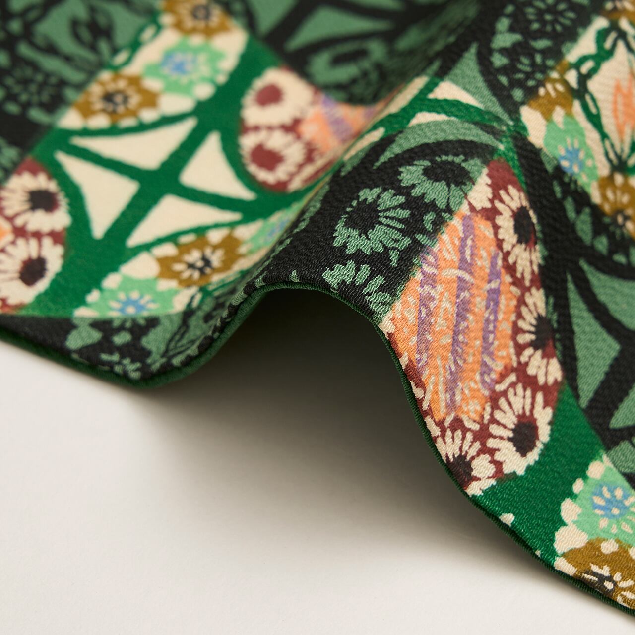 さらに染められた模様の上全体に萌葱色の三角形が重ねて染められ、可愛らしいお花に窓から陽の光が射しているような、シャープさも感じられるお洒落な雰囲気の型絵染の九寸名古屋帯です。
