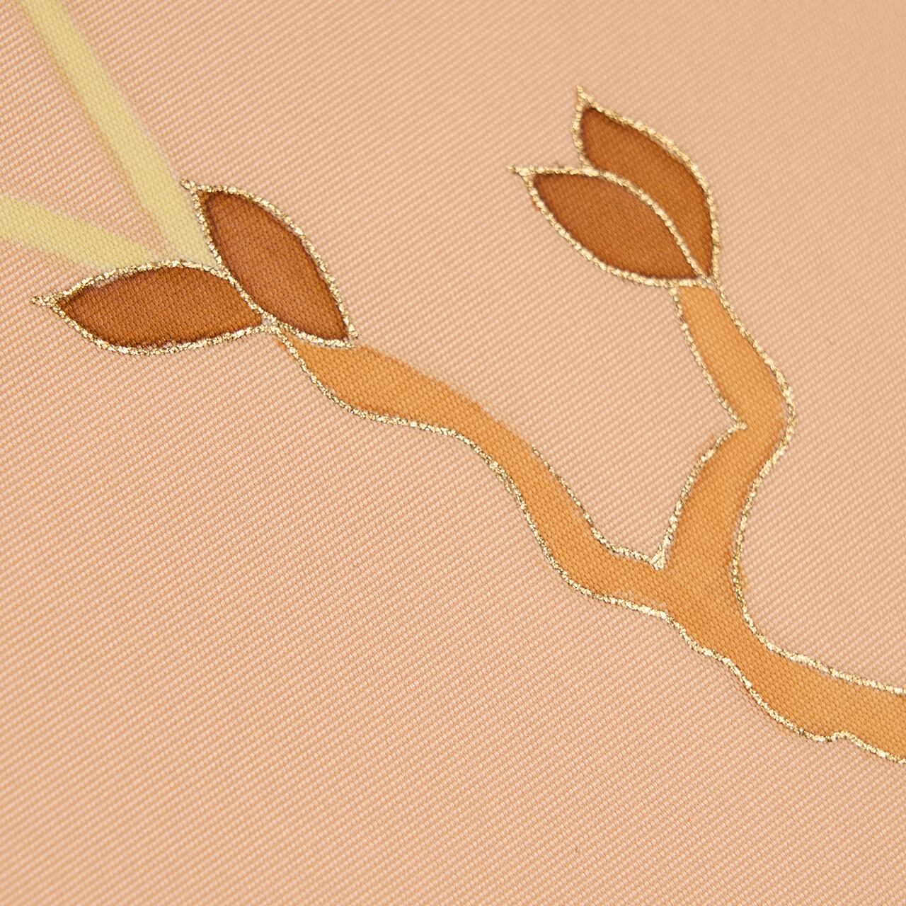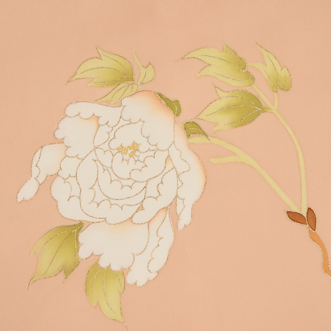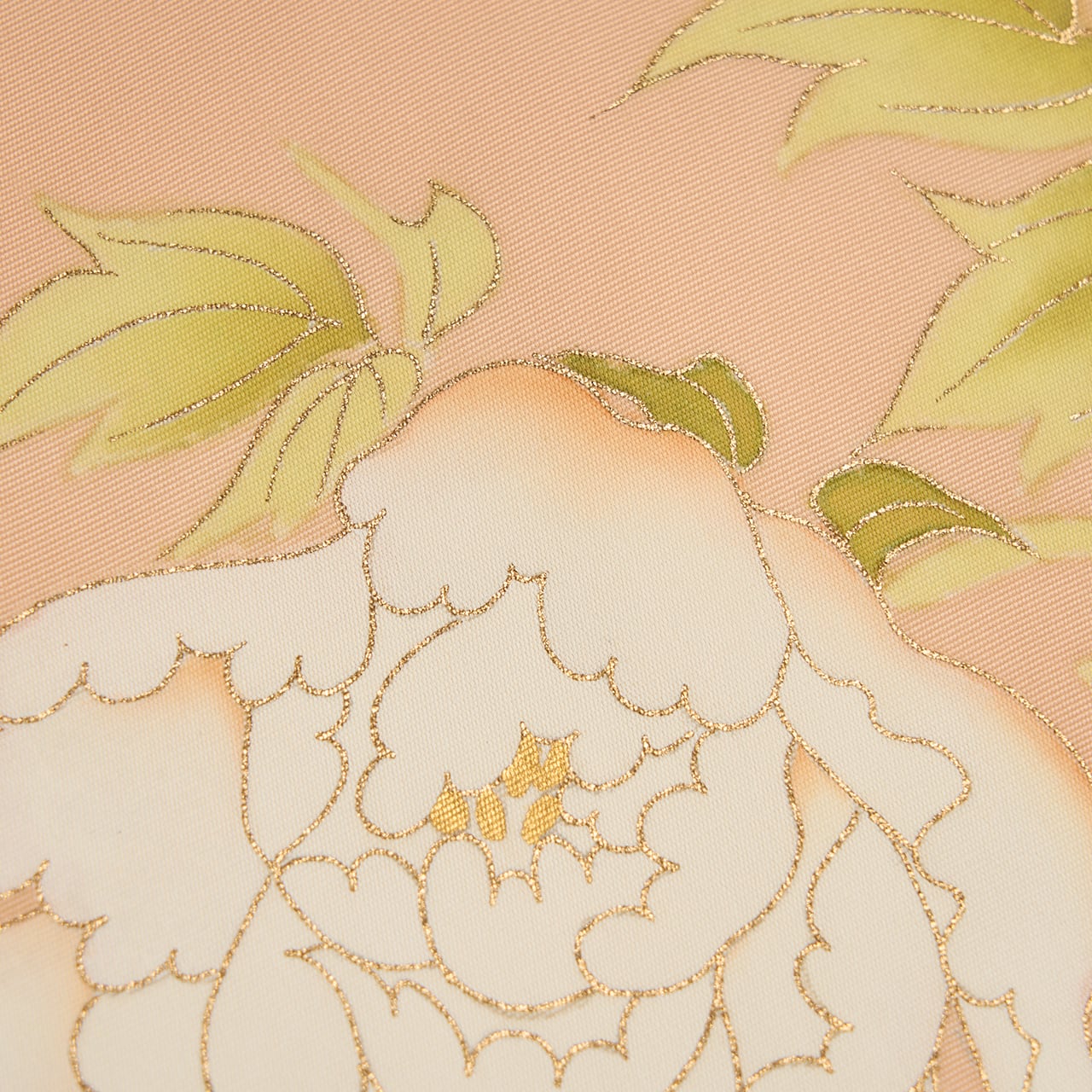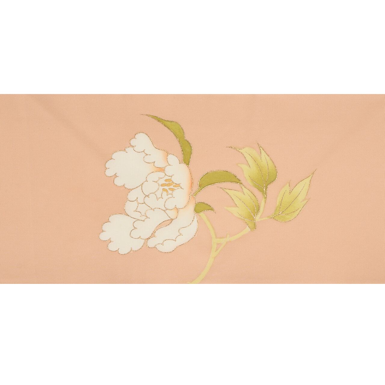 少しベージュ味のある淡いオレンジ系の色・洗柿色のしっかりとした塩瀬の生地に、お太鼓には大きな白いお花をつけた牡丹が手描きの友禅で見事に描かれた、素晴らしく華やかな九寸名古屋帯です。