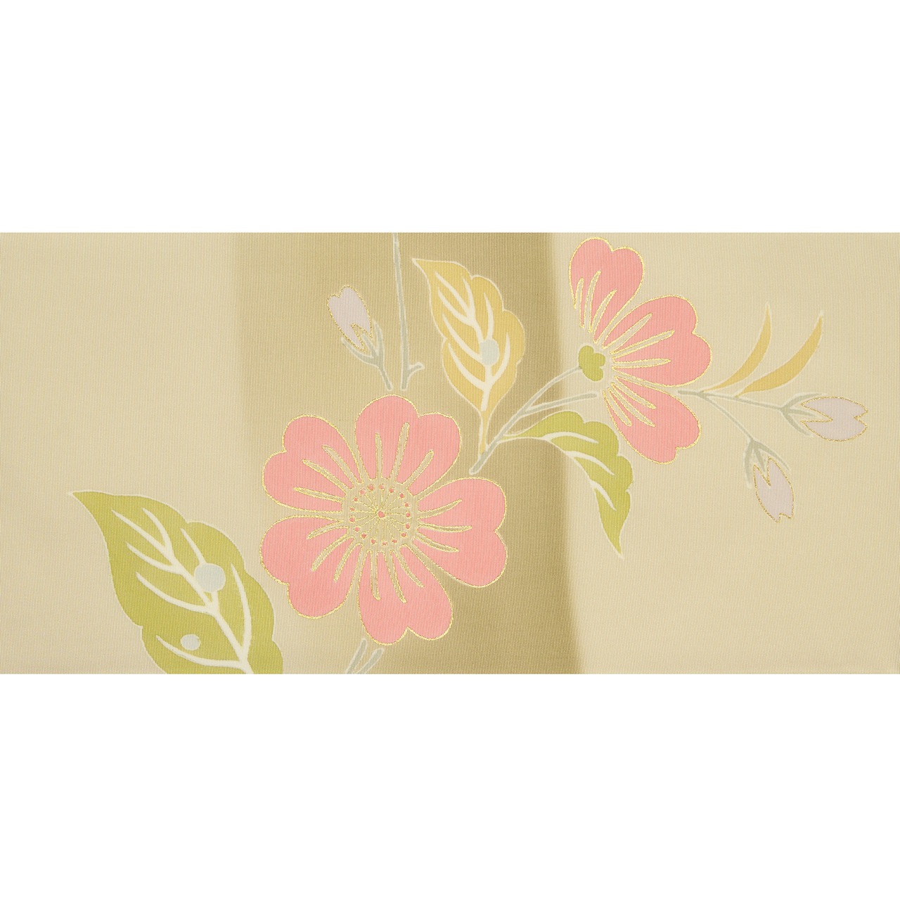 桜のお花のモチーフもいろいろとありますが、こういった友禅系ですと枝垂れ桜のモチーフが多く見られる中、こちらは伸びあがるような枝ぶりで描かれていて、とてもフレッシュな活き活きと目に映ります。