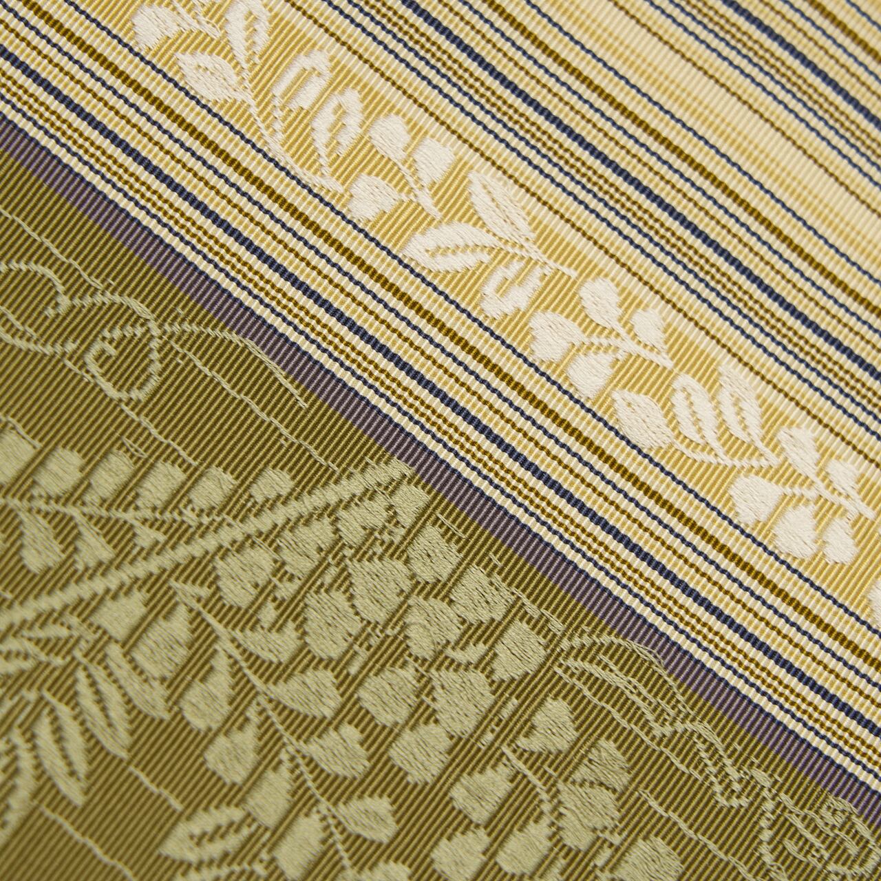 博多織ならではシャキッとした質感の淡いベージュ・亜麻色の地に、右側には太い鶸茶色の縞が織られ、その中には藤のお花が藤棚から下がって咲く様子が織り出され、そのまわりの細縞は朽葉色、濃色の紫、白橡色のベージュなどが集合してグループで織られ、その間のやや太い縞には蔓草の模様が織り込まれていて、それぞれが引き立て合うようにお洒落な模様を構成しています。