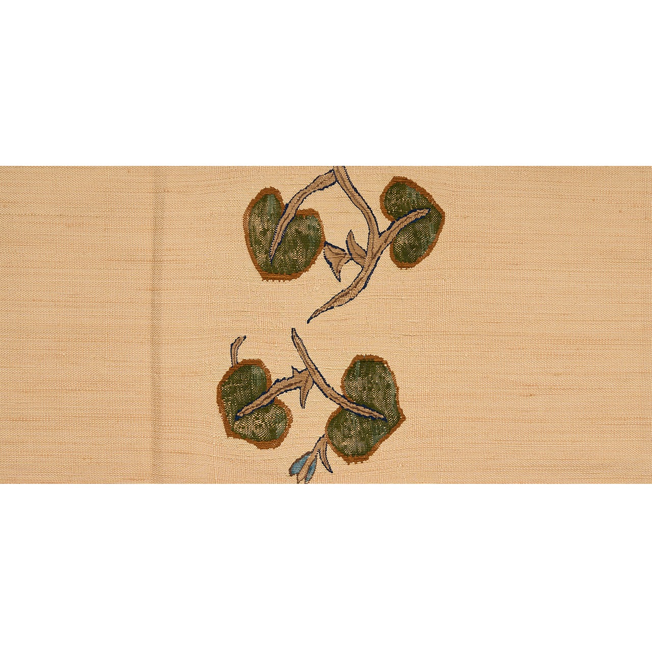 縦にシュシュッとした混ざり糸のような線が織り込まれた、やや厚めのふっくらとした砥粉色の紬地に、お太鼓には元気よく蔓を伸ばして緑の葉を広げる蔦の様子が手機のすくい織で巧みに織り出された、くっきりとした模様が清々しい素敵な八寸名古屋帯です。